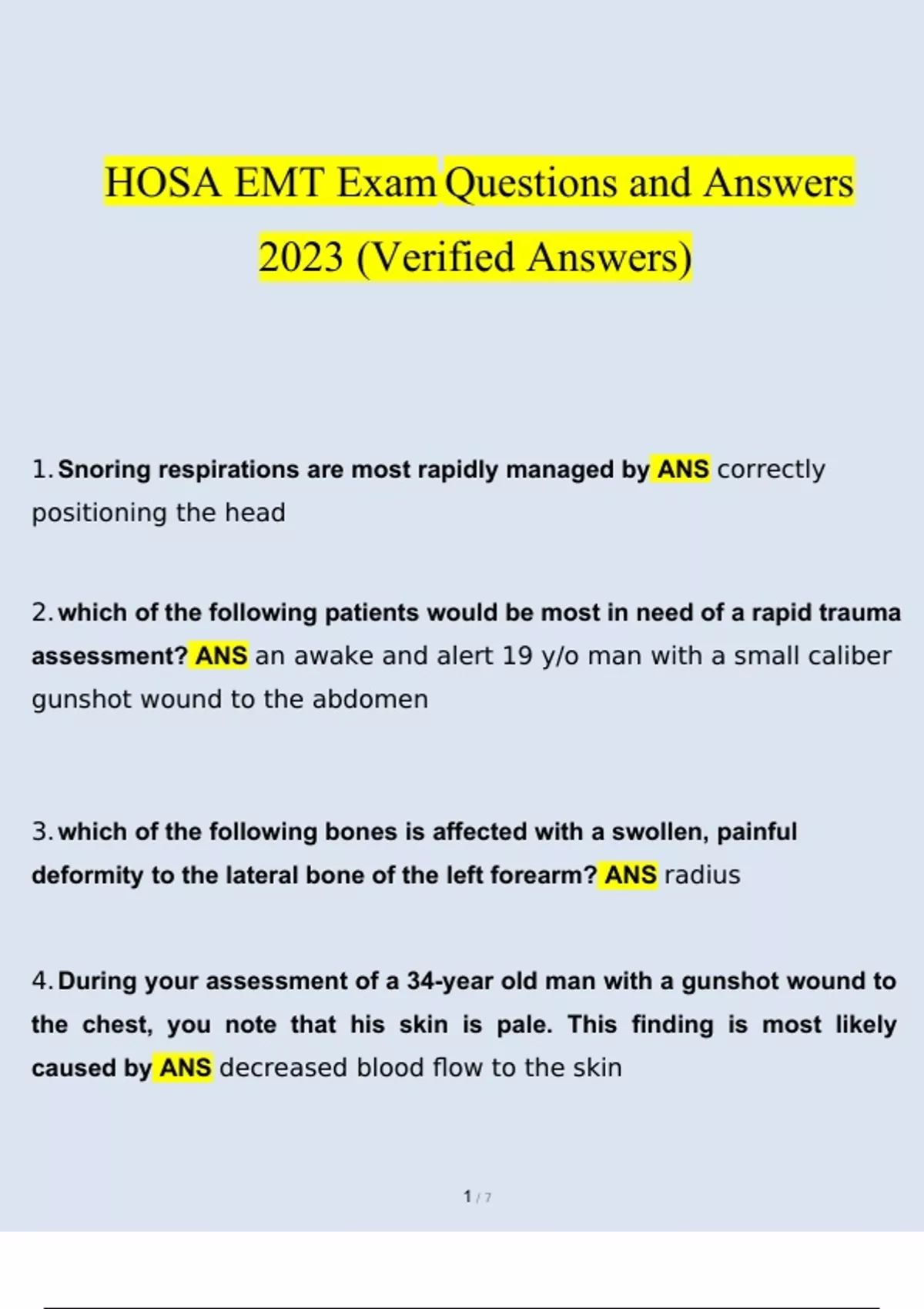 HOSA EMT Practice Test Questions and Answers 2023 (Verified Answers)