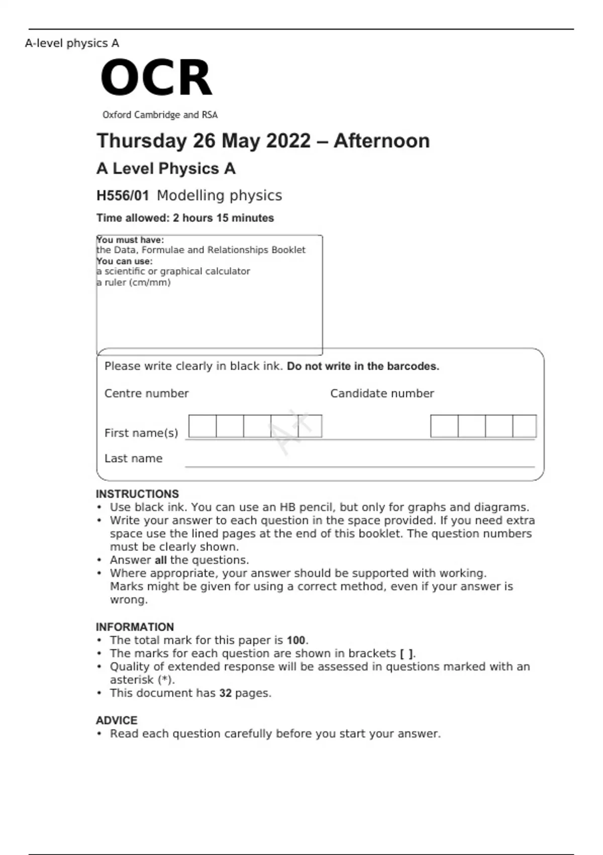 OCR A Level Physics A H556/01 JUNE 2025 QUESTION PAPER and MARK SCHEME