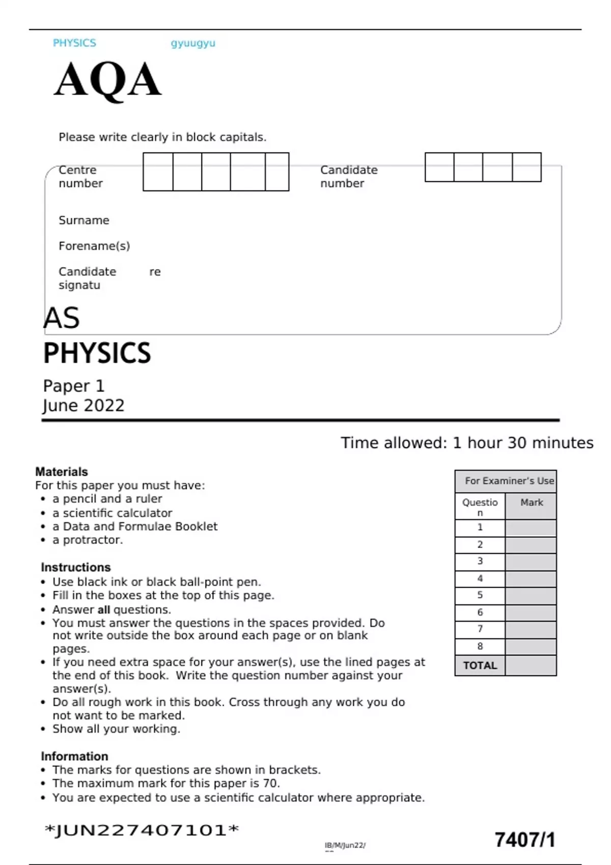 AQA AS Physics paper 1 and 2 June 2022 question paper and mark scheme
