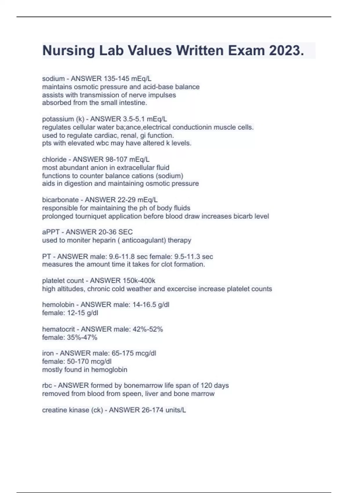NRS LAB VALUES,LATEST VERSION,VERIFIED QUESTIONS AND ANSWERS 2023 EDITION.
