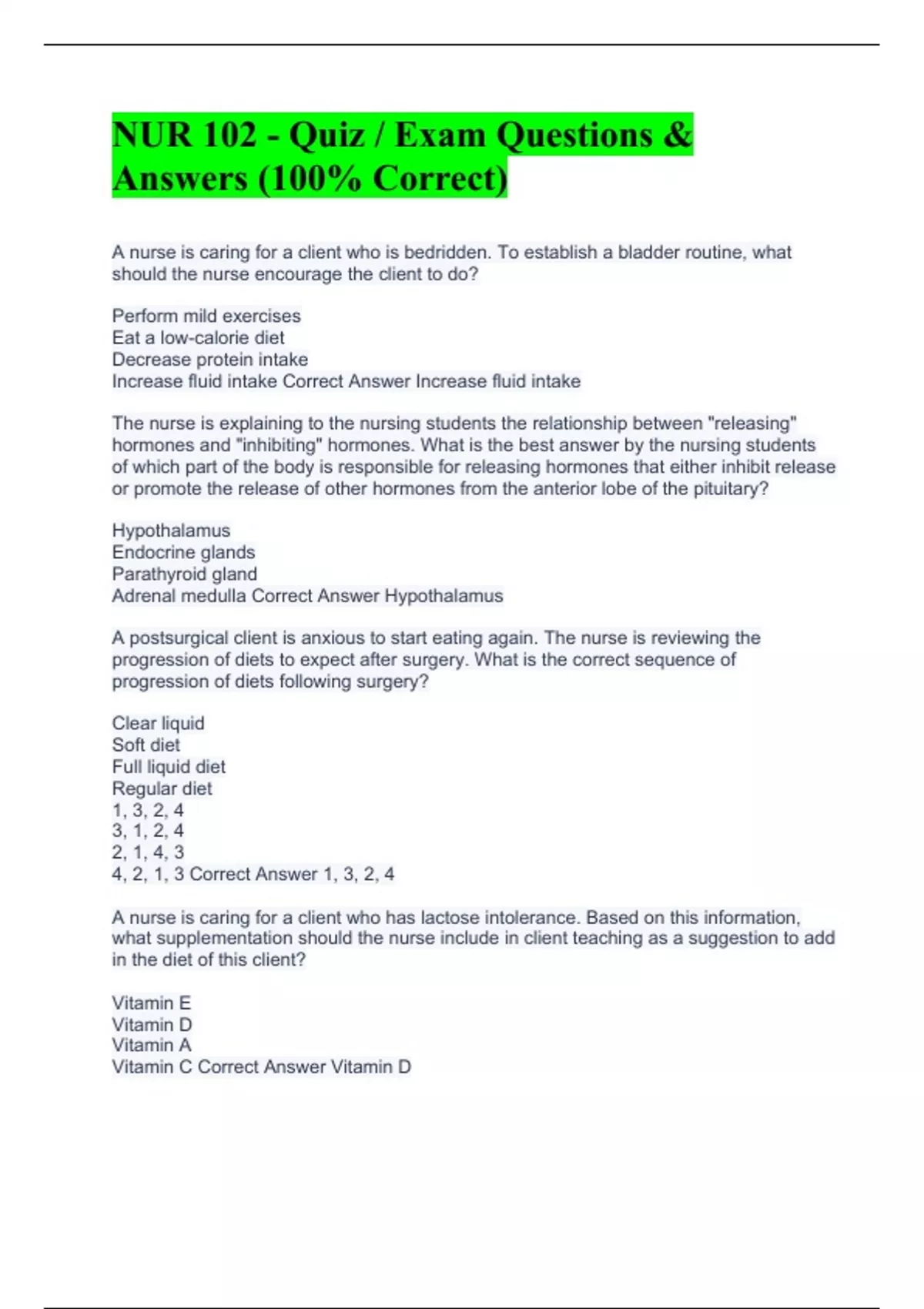 NUR 102 Comprehensive Final Exam Complete Questions with 100% Correct Answers. NUR 102 Final Exam Questions with 100% Correct Answers. NUR 102 Comprehensive Final Exam Complete Questions with 100% Correct Answers. NUR 102 - Final Exam Questions with 100% Correct Answers (Tested and Verified) NUR 102 Final Exam (Questions with 100% Correct Answers)
