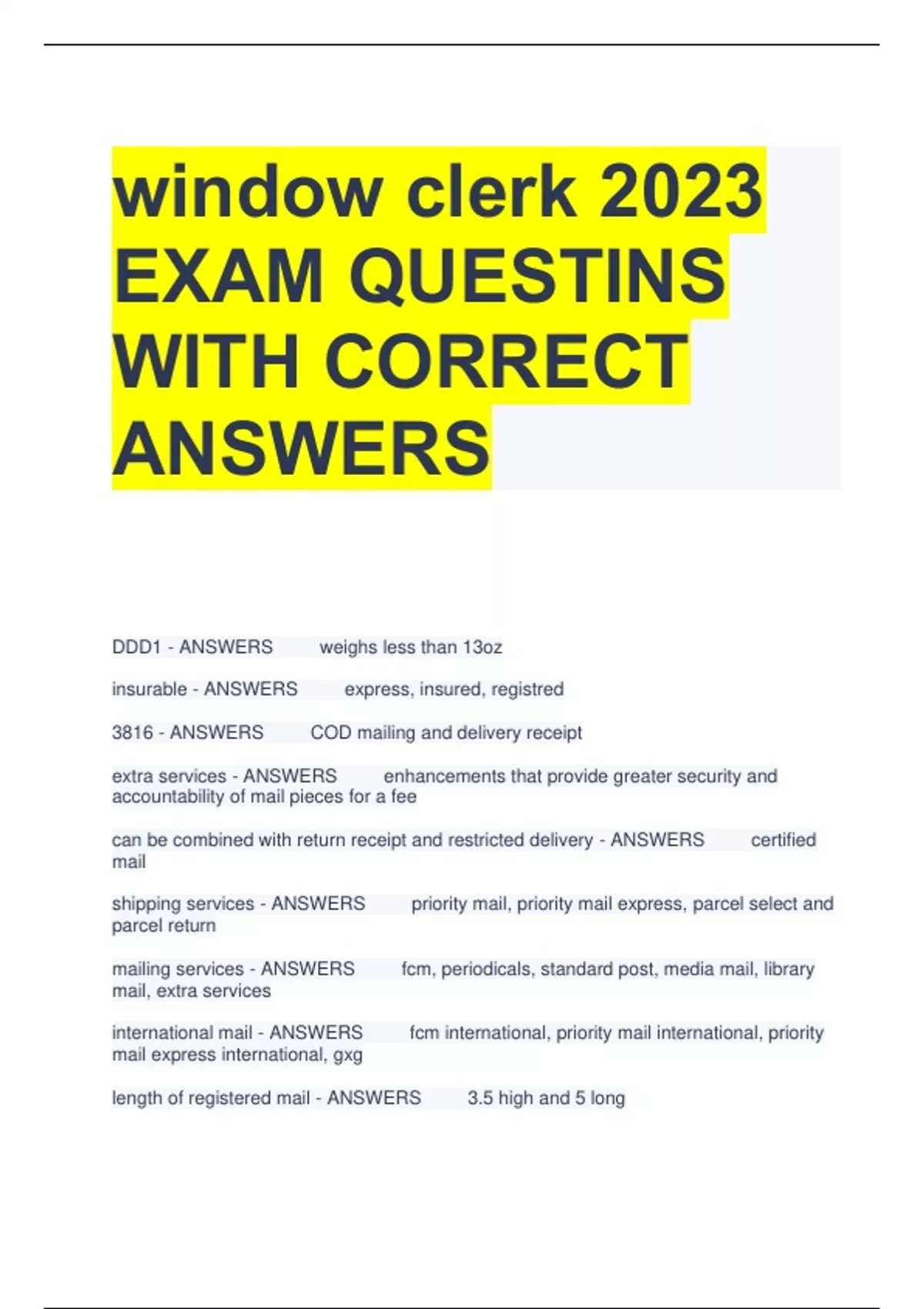 1 Exam (elaborations) WINDOW CLERK 421 EXAM QUESTIONS WITH 100% COMPLETE SOLUTIONS 2 Exam (elaborations) USPS Exam 421 Window Clerk Practice EXAM QUESTIONS WITH COMPLETE SOLUTIONS 3 Exam (elaborations) USPS Exam 421 Window Clerk 2023 EXAM QUESTIONS WITH 100% COMPLETE ANSWERS 4 Exam (elaborations) Exam 421 Window Clerk QUESTIONS AND ANSWERS 5 Ex