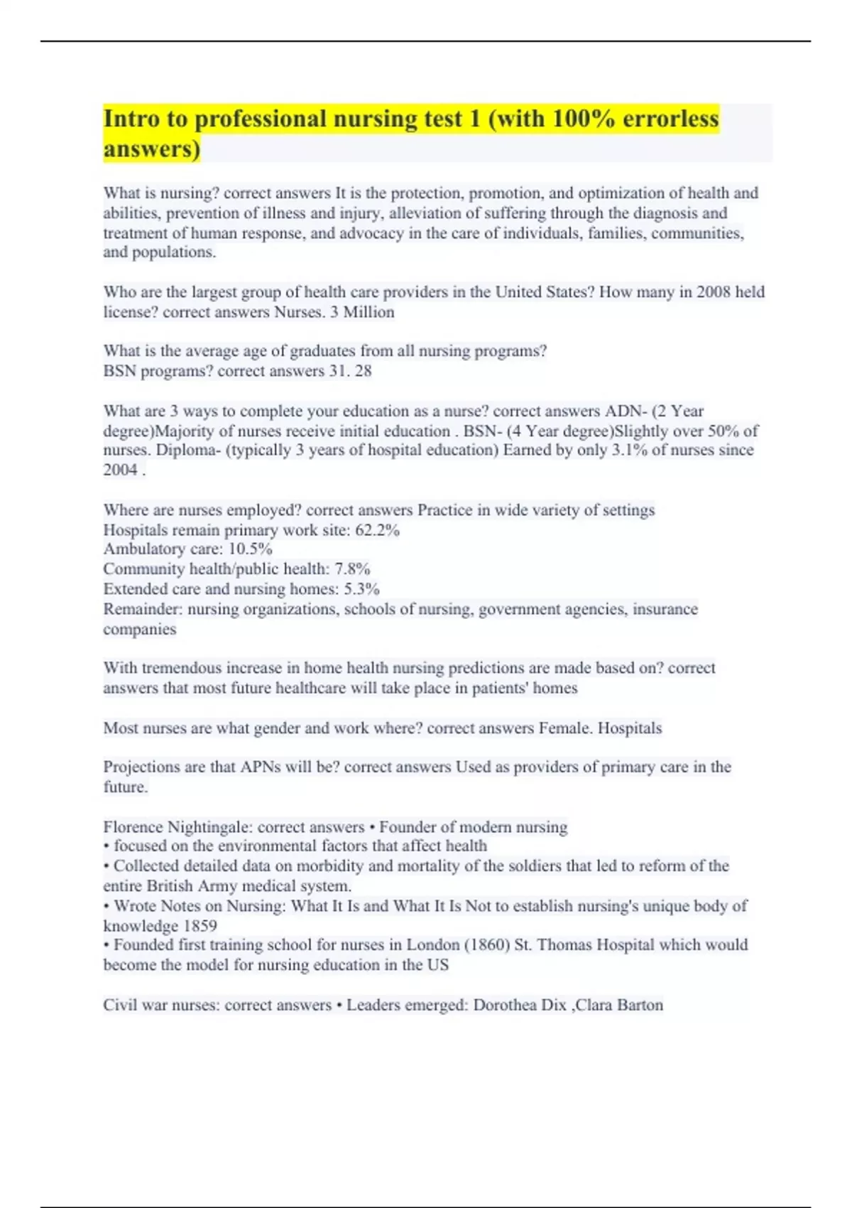 Here we offer revised study materials to elevate your educational outcomes. We have verified learning materials (Research, Exams Questions and answers, Assignments, notes etc) for different courses guaranteed to boost your academic results. We are dedicated to offering you the best services and you are encouraged to inquire further assistance from our end if need be. Having a wide knowledge in Nursing, trust us to take care of your Academic materials and your remaining duty will just be to Excel. Remember to give us a review, it is key for us to understand our clients satisfaction. We highly appreciate clients who always come back for more of the study content we offer, you are extremely valued. All the best.