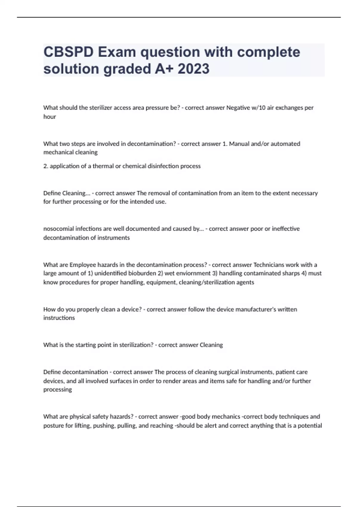 Sterile Processing CBSPD Test correctly answered 2023 graded A+