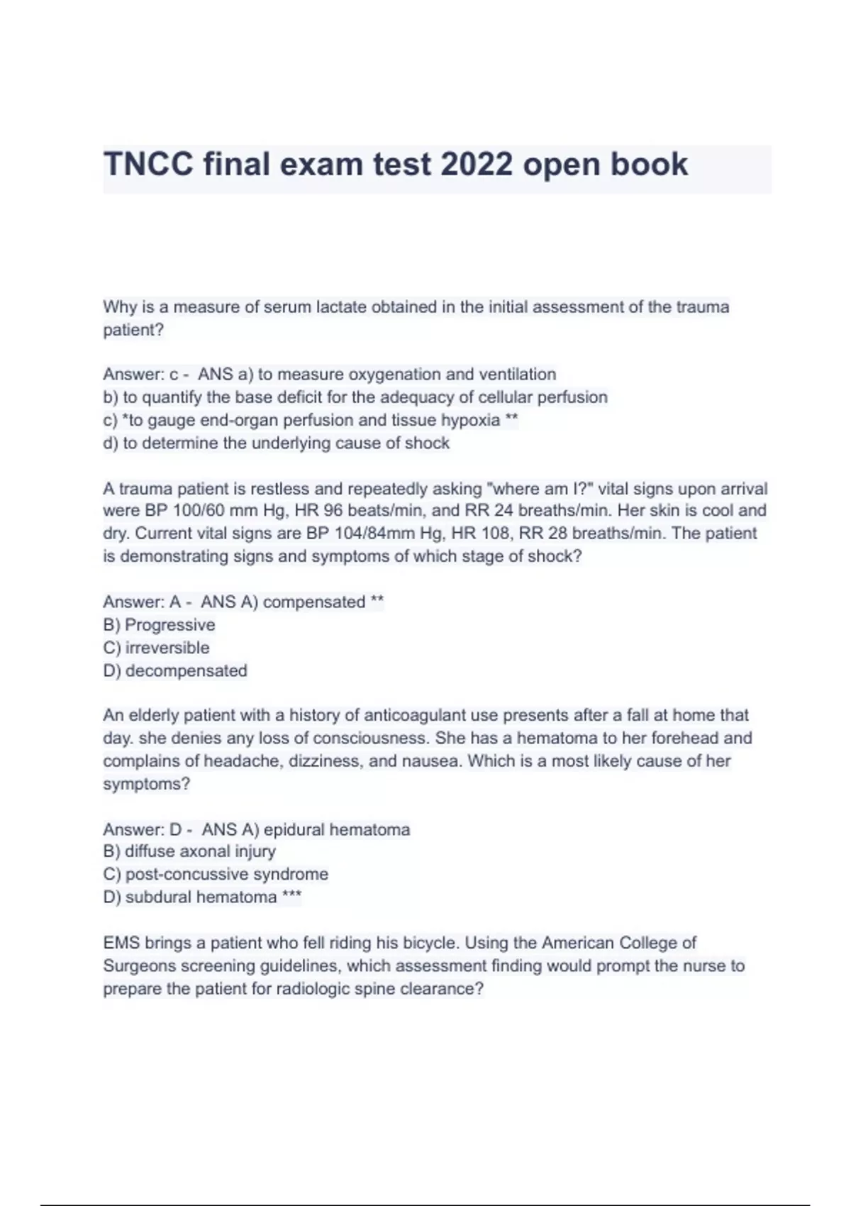 TNCC 8th Edition Questions & Answers 2023 ( A+ GRADED 100% VERIFIED)