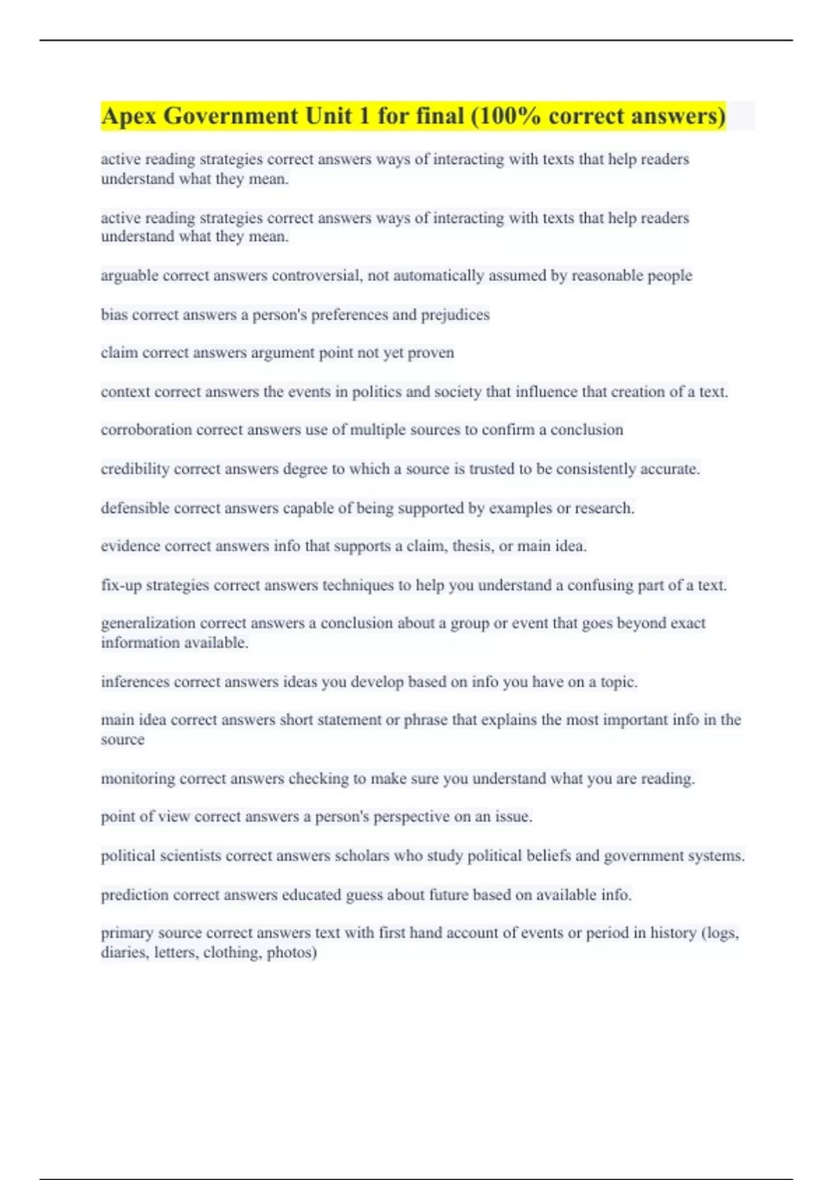 Apex Government Full Key Terms (Graded A+ already) Apex Government Unit 1 for final (100% correct answers) American Government Apex (A+ Graded already) American gov. unit 5 –apex (100% errorless answers) American Gov. Unit 6 –apex (with complete solutions) Apex Government Unit 3 (with error-free answers) Apex Gov. Unit 1 (A+ Graded)