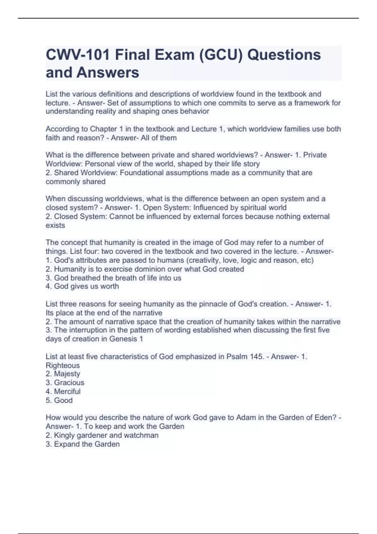 CWV-101 Final Exam (GCU) Questions and Answers CWV-101 FINAL EXAM STUDY GUIDE (LATEST UPDATED) CWV 101 Final Exam 2023 with complete solutions CWV-101 Exam Questions and Answers 2023 CWV-101 Final Exam GCU Questions and Answers CWV 101 FINAL EXAM 2023 Final Exam CWV 101 GCU Jenkins Questions and Answers CWV-101 Final Exam with complete solutions