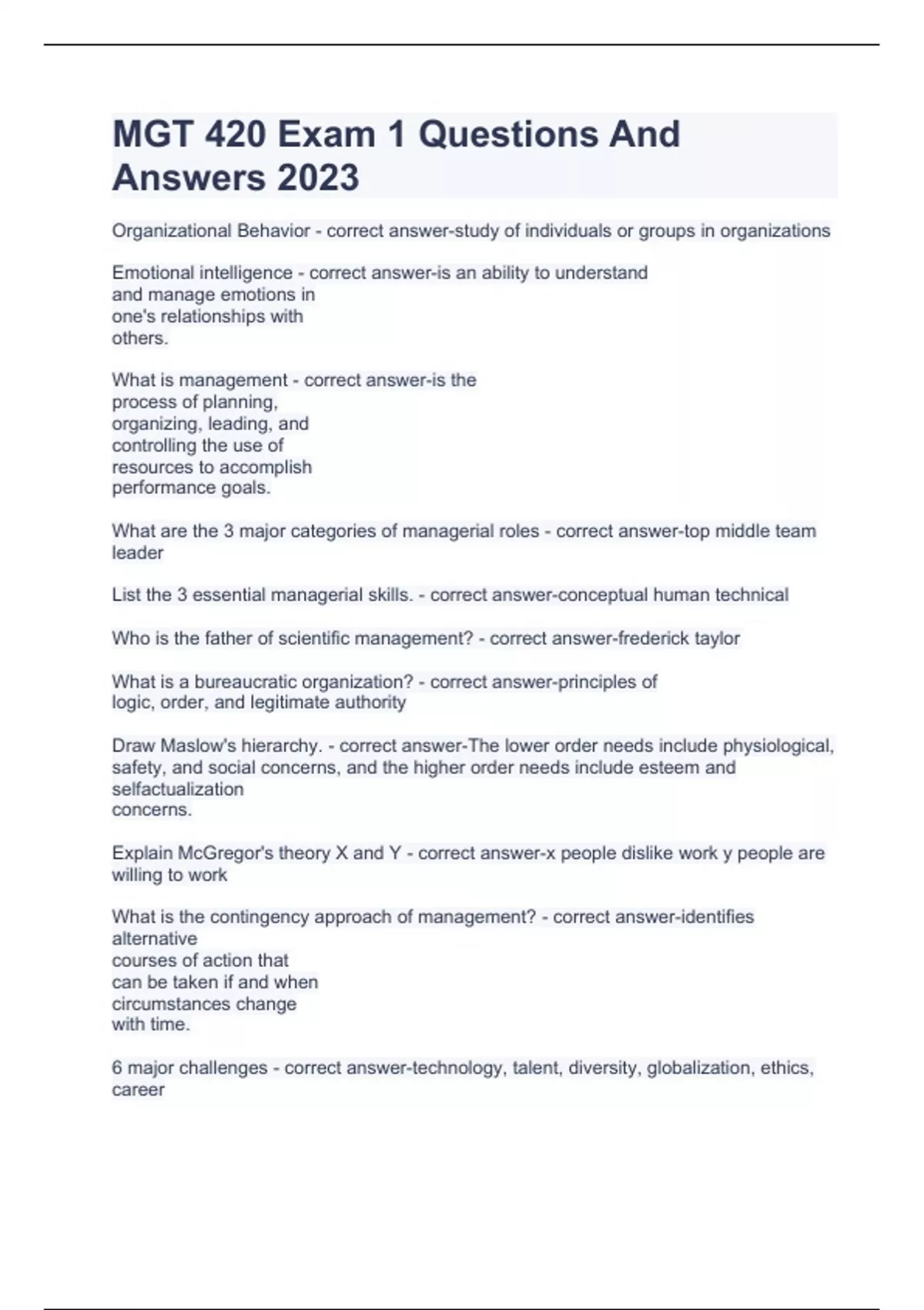 ASU MGT 420 Exam 1 With Complete Solutions 2023 MGT 420 Exam 1 With 100% Correct Answers 2023 GCU MGT-420 Exam 1 Questions And Answers 2023 MGT 420 Midterm Exam With Complete Solutions 2023 MGT 420 FINAL EXAM Questions And Answers 2023 GCU MGT-420 Exam 1 With 100% Correct Answers 2023 MGT 420 Exam 1 With Complete Solutions 2023
