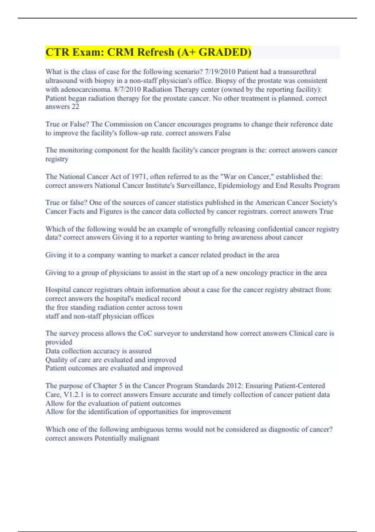 CTR Exam Prep (All Sources Combined) Questions with correct answers; A+ GRADED NCRA CTR Exam Practice Test (All solved correctly) CTR Exam: CRM Refresh (A+ GRADED)