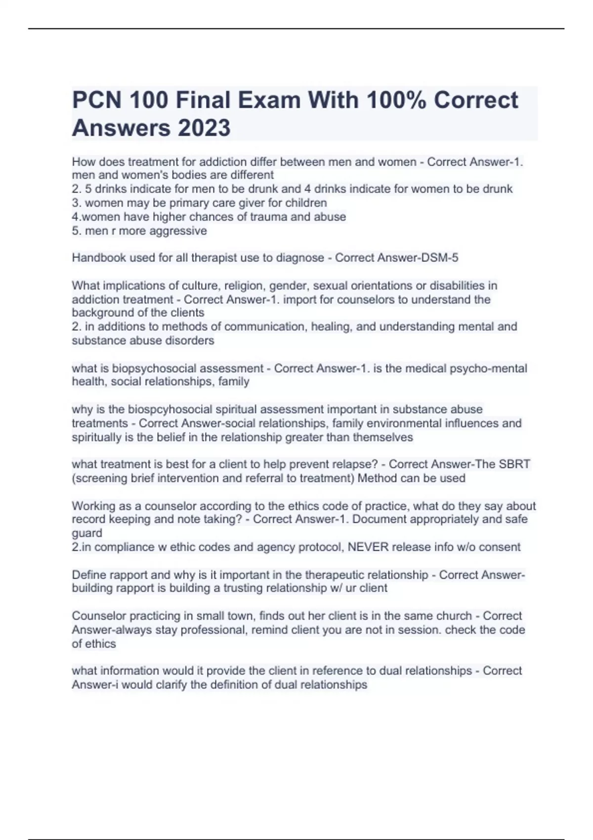 PCN-100 Final Review Exam With 100% Correct Answers 2023 PCN 100 Topic 7 Questions and Answers 2023 PCN- 100 Final Exam Study Guide - Foundations of Substance Abuse with Complete Solution 2023 PCN-100 Review Exam With 100% Correct Answers 2023 PCN-100 Final Exam Study Guide with Complete Solution 2023 PCN 100 Final Exam With 100% Correct Answers