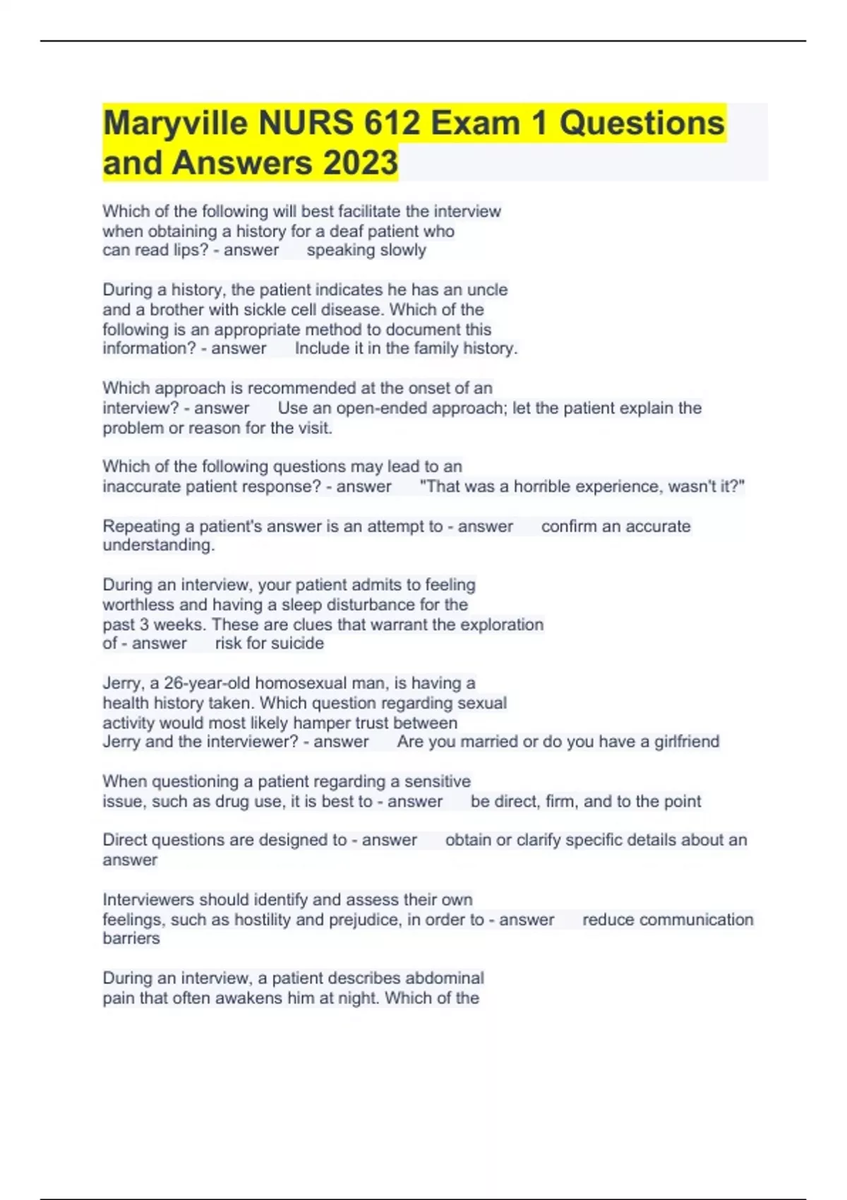 Exam (elaborations) Maryville AHA NURS 612 Exam 2 Workbook questions with complete Answers graded A+ Exam (elaborations) Maryville AHA 612 exam 1 Questions and Answers 2023 Exam (elaborations) NURS 612 Maryville Exam 2 Questions and Answers 2023 Exam (elaborations) Maryville 612 Exam 1 Advanced Health Assessment Questions and Answers 100% co