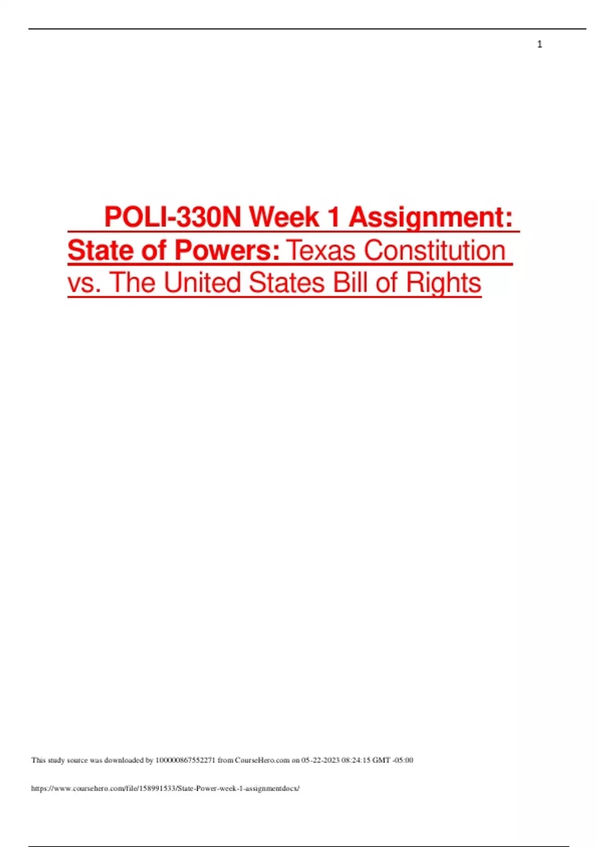 POLI 330N Week 1 Assignment: State of Powers: State if Illinois and The United States Bill of Rights POLI-330N Week 1 Assignment: State of Powers: Texas Constitution vs. The United States Bill of Rights POLI 330N Week 1 Assignment: State of Powers: Florida vs. The United States Bill of Rights POLI-330N Week 1 Discussion: Determining Democracy (Opti