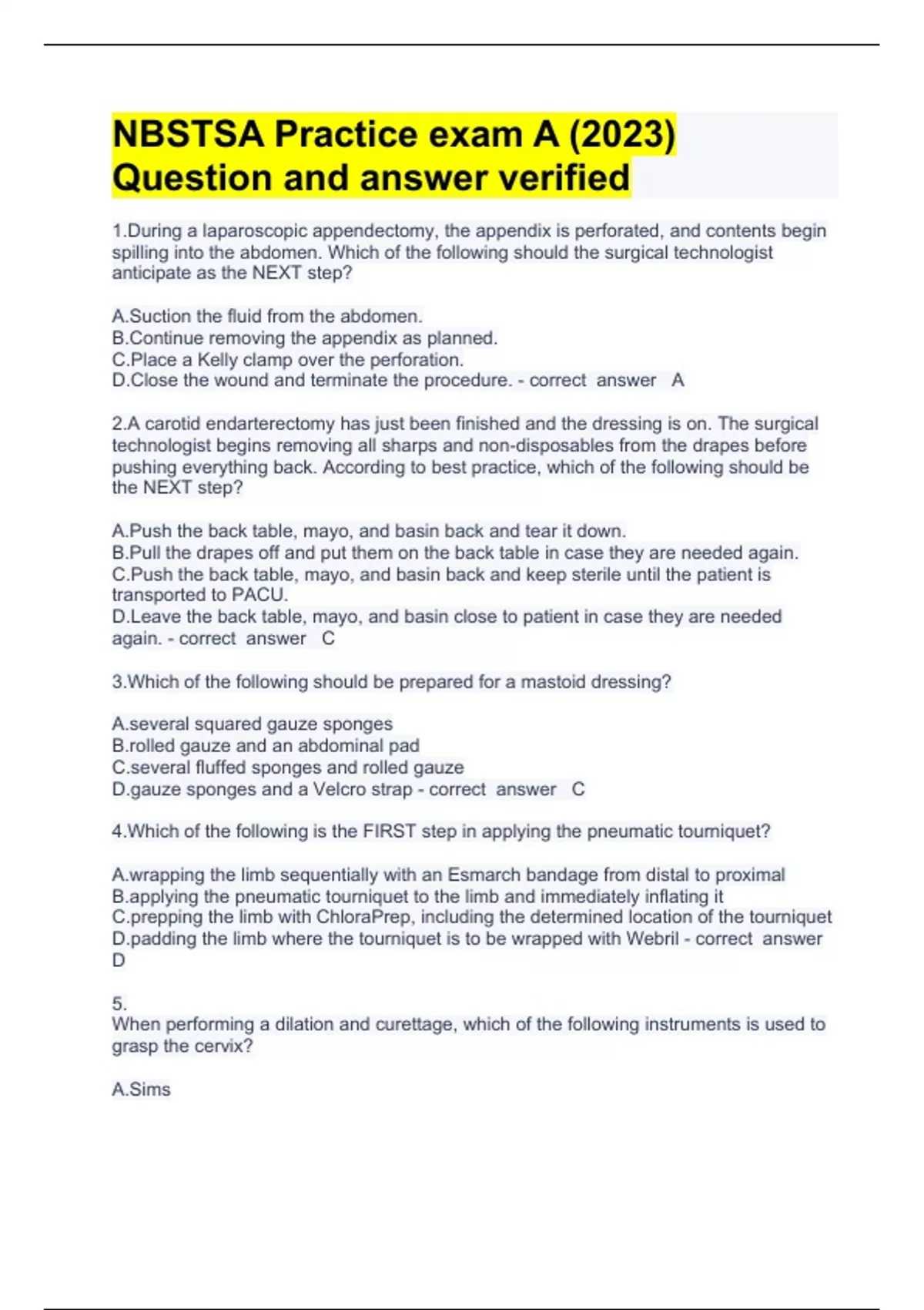 Surg Tech Exam 1 Question and answer already solved 2023 Exam (elaborations) Surgical Tech - Test Bank Questions (Week 1) Orientation Question and answer rated A 2023 Exam (elaborations) Ch.1 Matching Acronyms (Orientation to Surgical Technology) Question with complete solution 2023 Exam (elaborations) Into Surgical Tech 101 Final Exam revie