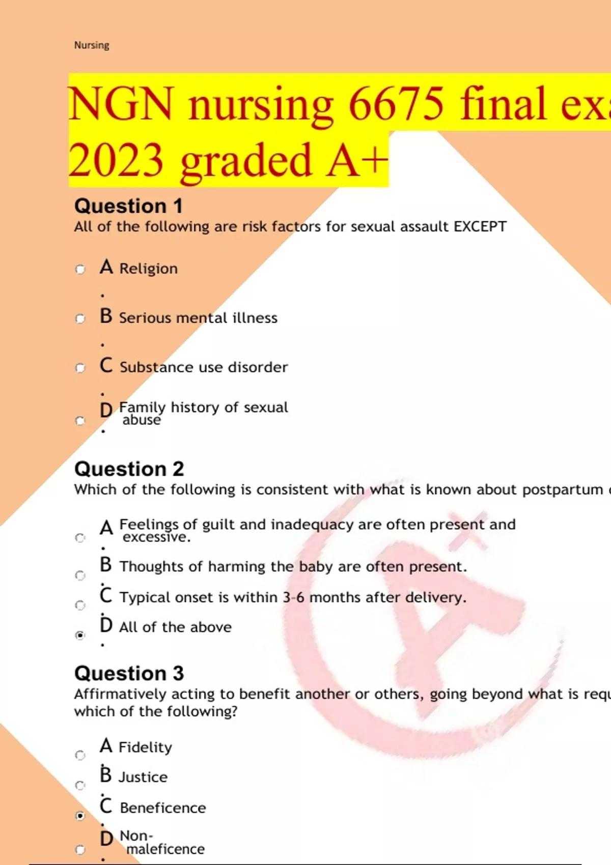 NGN Overview of Professional Nursing Concepts for Medical-Surgical Nursing 2023/2024 graded A MULTIPLE CHOICE 1. A nurse wishes to provide client-centered care in all interactions. Which action by thenursebest demonstrates this concept? a.Assesses for cultural influences af ecting health care b. Ensures that all the clients basic needs are met c.