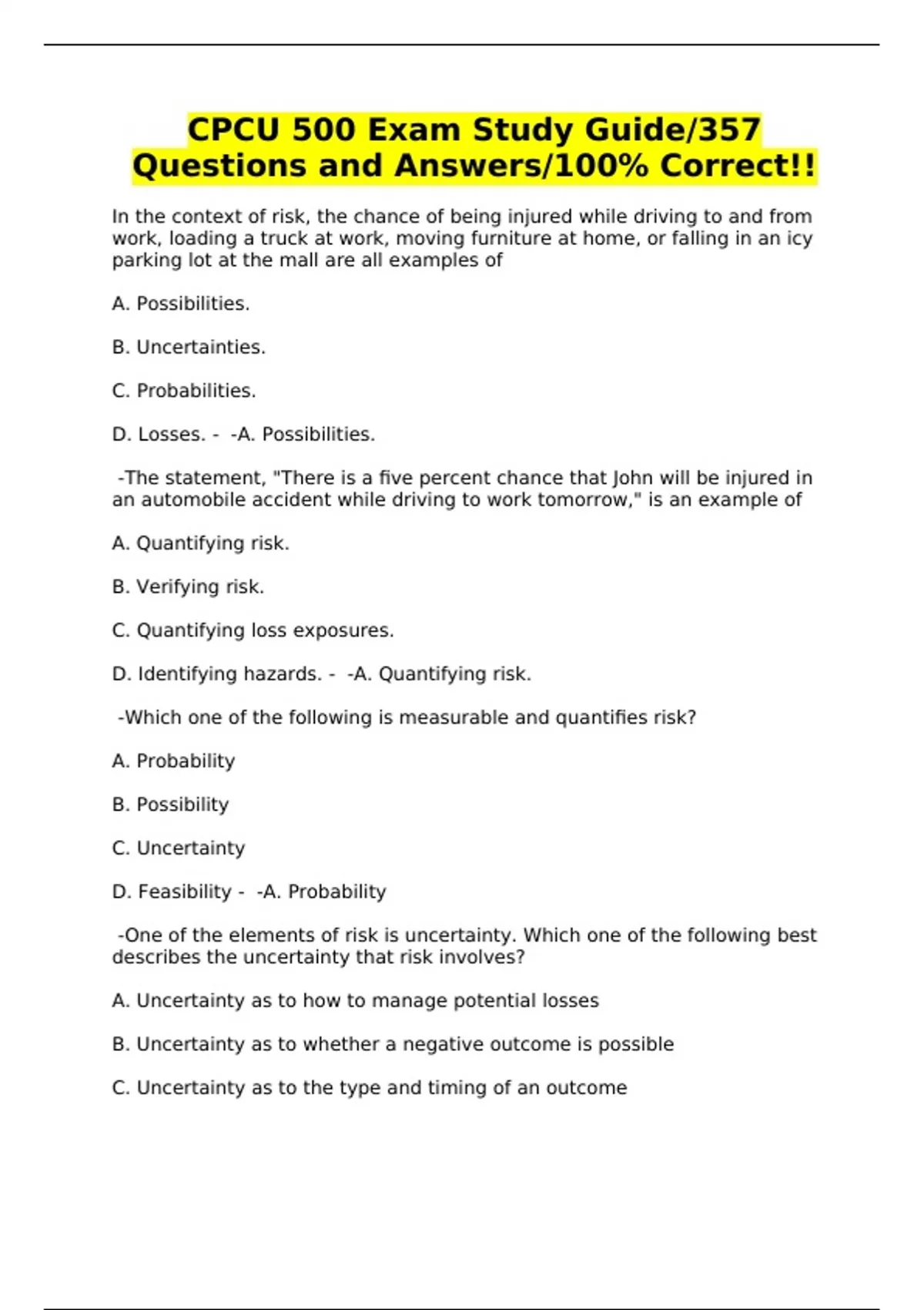 CPCU 500 EXAMS - QUESTIONS AND ANSWERS - PACKAGE DEAL