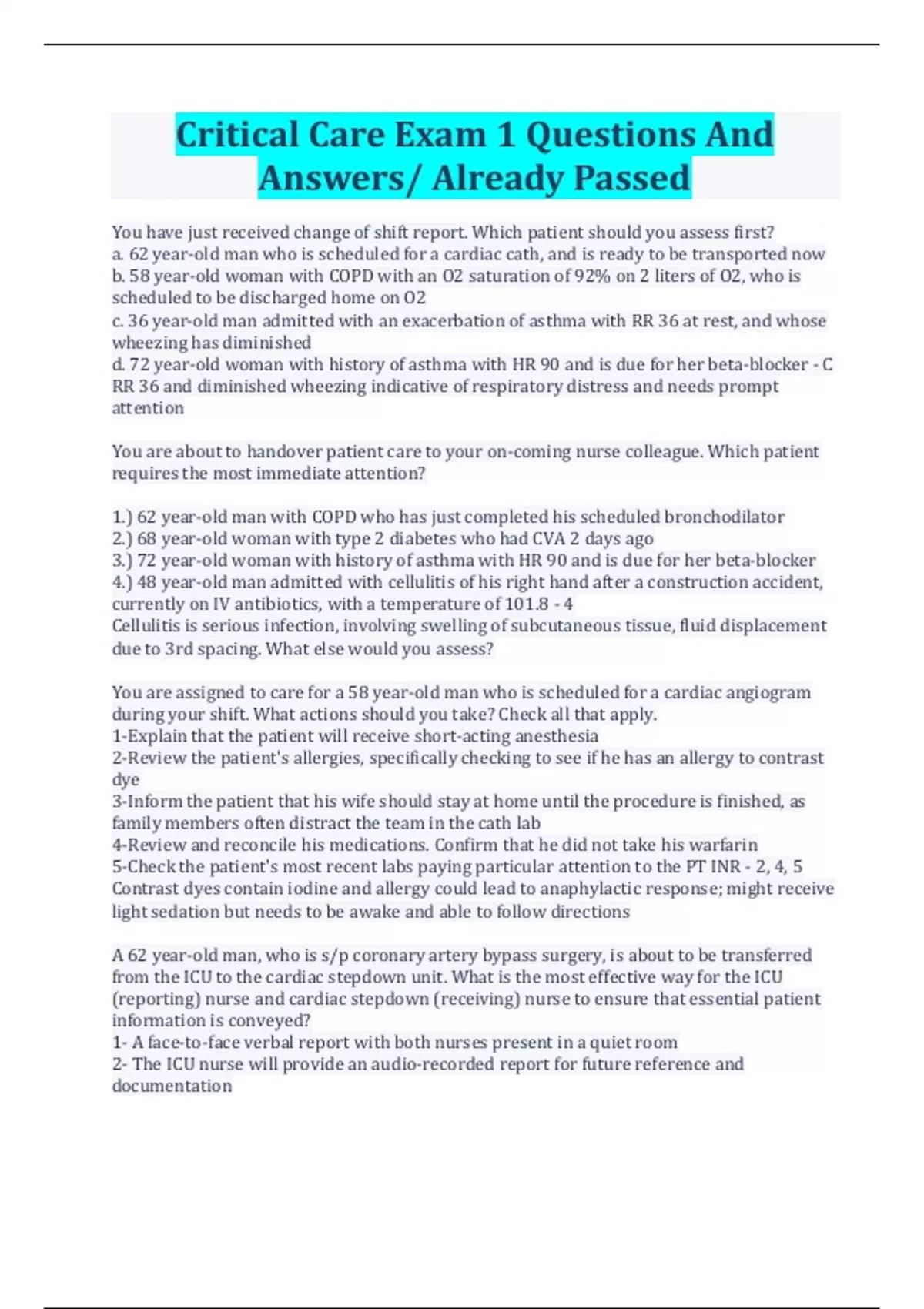 Critical Care Final Exam Practice Questions And Answers Already Passed