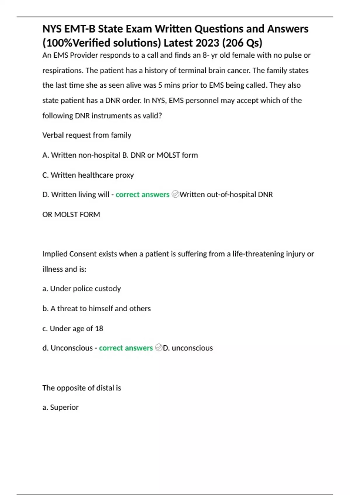 NYS EMT-B State Exam Written Questions and Answers (100%Verified solutions) Latest 2023 (206 Qs) 2 Exam (elaborations) NYS EMT Written Exam Q&As Latest Update 2023 3 Exam (elaborations) NYS EMT EXAM PRACTICE TEST #1 Questions solved (Latest 2023) 4 Exam (elaborations) NYS EMT Exam Comprehensive Review Questions Solved (verified Answers) 78Qs. 5