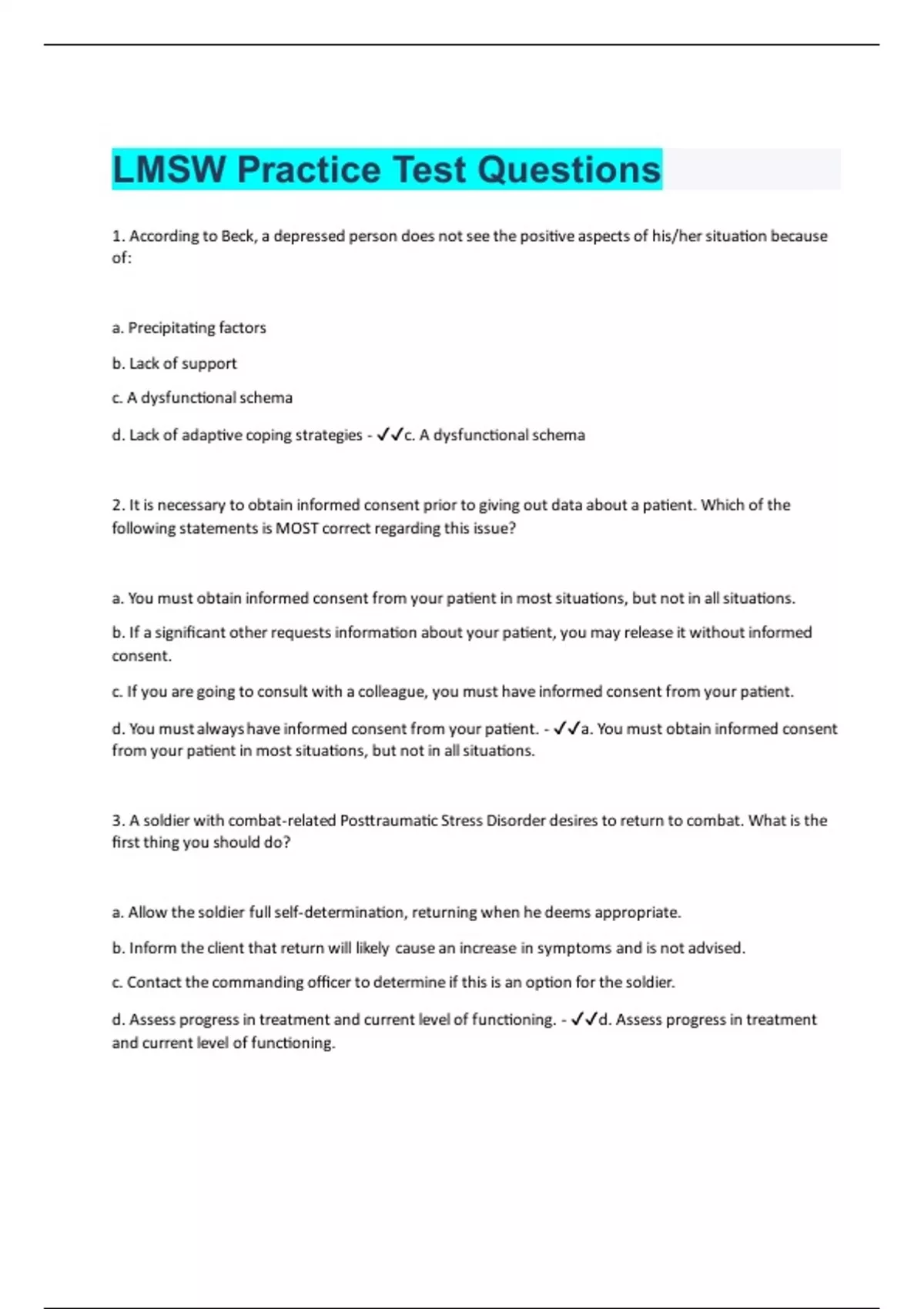 LMSW Practice Questions| Questions with 100 % Correct Answers | Verified