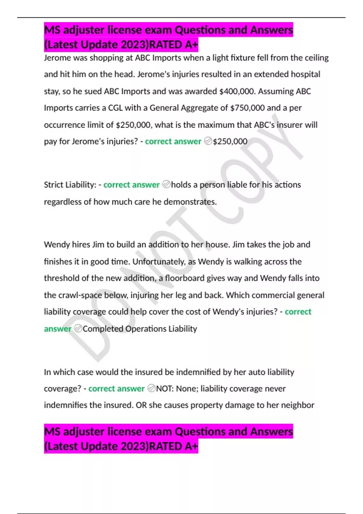 MS adjuster license exam Questions and Answers (Latest Update 2023)RATED A+