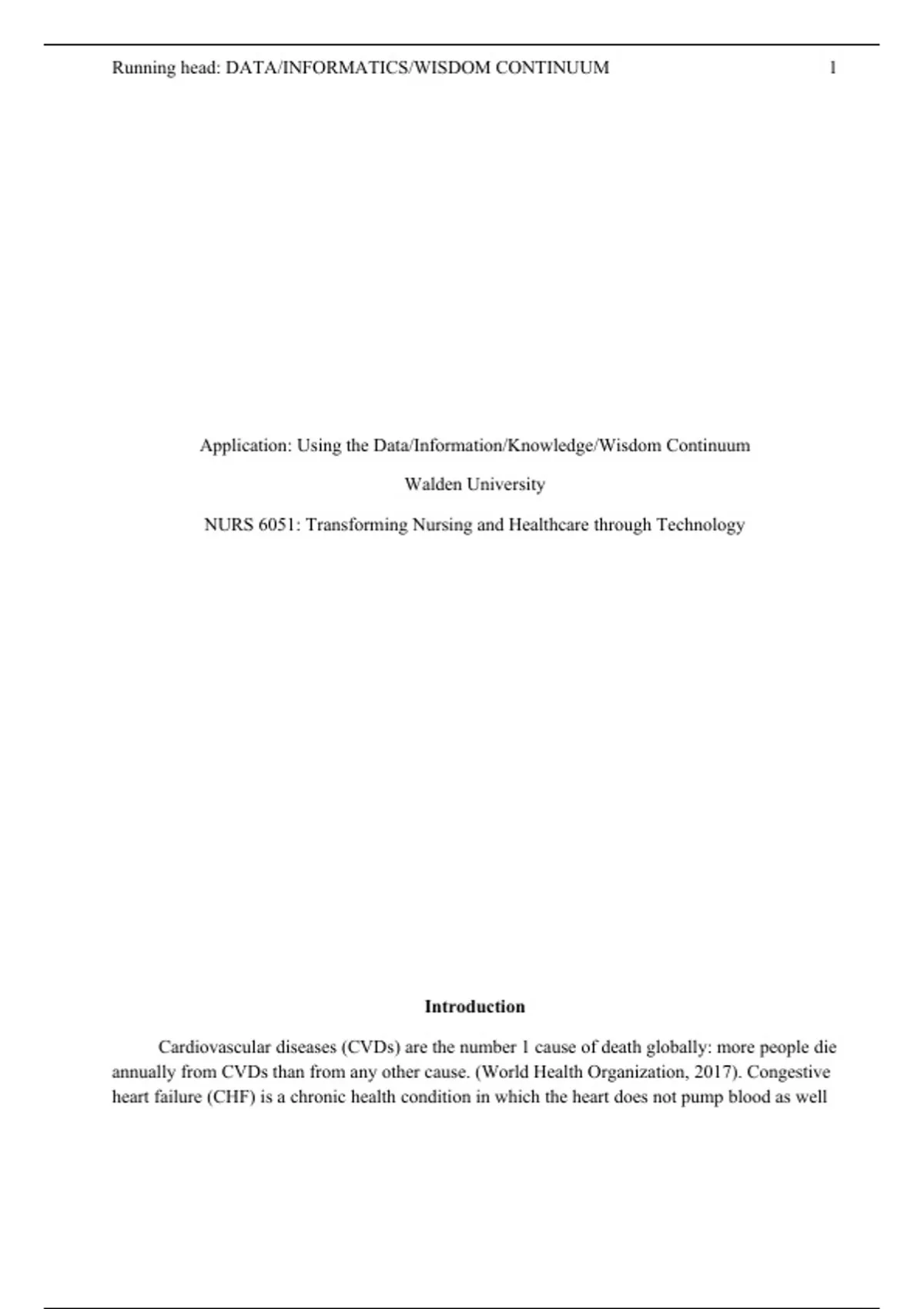 1. NURS 6051 Week 3 & 4 Assignment (Using the Data, Information, Knowledge, Wisdom Continuum) 2. NURS 6051 Week 5 & 6 Assignment: Application - Adoption of New Technology System 3. NURS 6051 Week 7 & 8: Assignment Application - Creating a Flowchart 4. NURS 6051 Week 11 Assignment: Application - Health Information Flyer