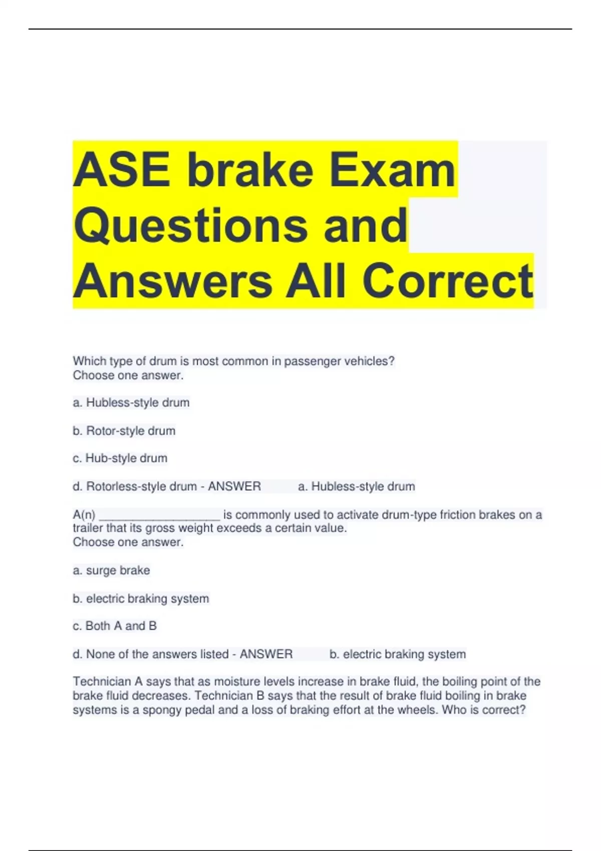ASE A5 – Brakes Exam Questions and Correct Answers 2 Exam (elaborations) ASE S4 Brakes Exam Questions with All Correct Answers 3 Exam (elaborations) ASE A5 Brakes Exam Questions and Answers All Correct 4 Exam (elaborations) ASE Brakes Practice Test Questions and Correct Answers 5 Exam (elaborations) Brakes ASE Test Questions and Answers All Cor