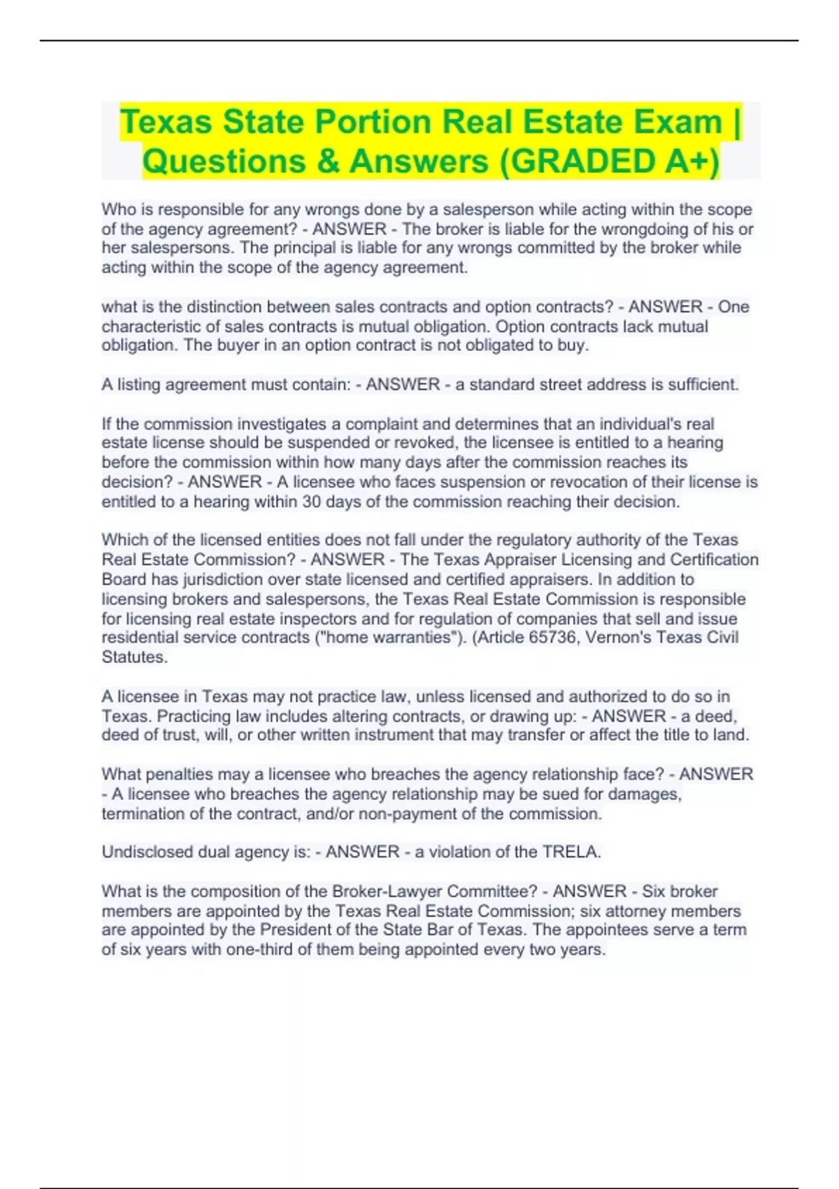 Texas Real Estate State Certification Exam (2023) – Questions & Answers(GRADED A+)