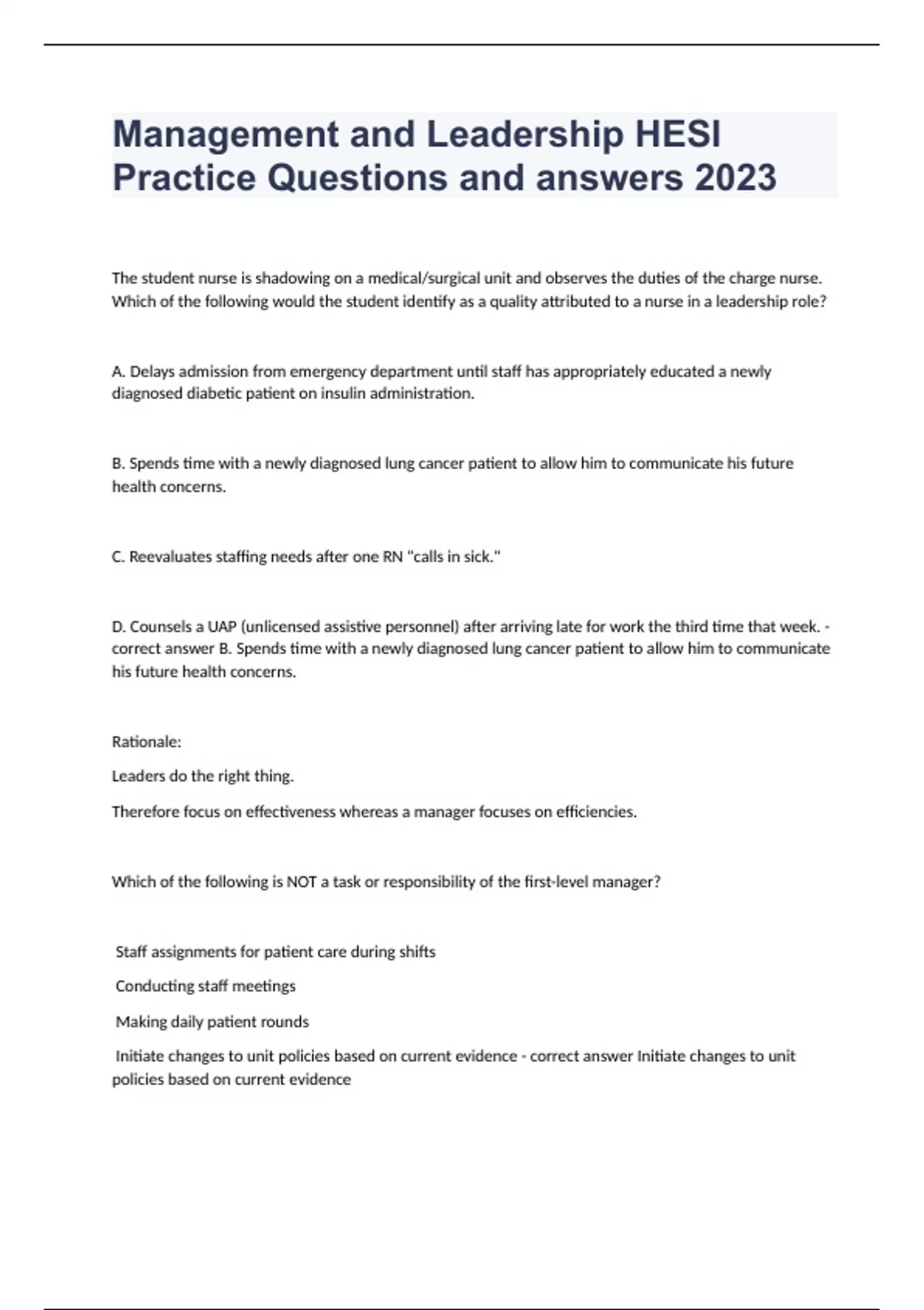 1 Exam (elaborations) Leadership and Management HESI correctly answered to pass 2023 2 Exam (elaborations) HESI Book Chapter 2- Leadership and Management Review(2023 updated)question and answers 3 Exam (elaborations) 2. Leadership and Management (Legal Aspects of Nursing) HESI book 2023 verified to pass Provide the laws that control and regulate