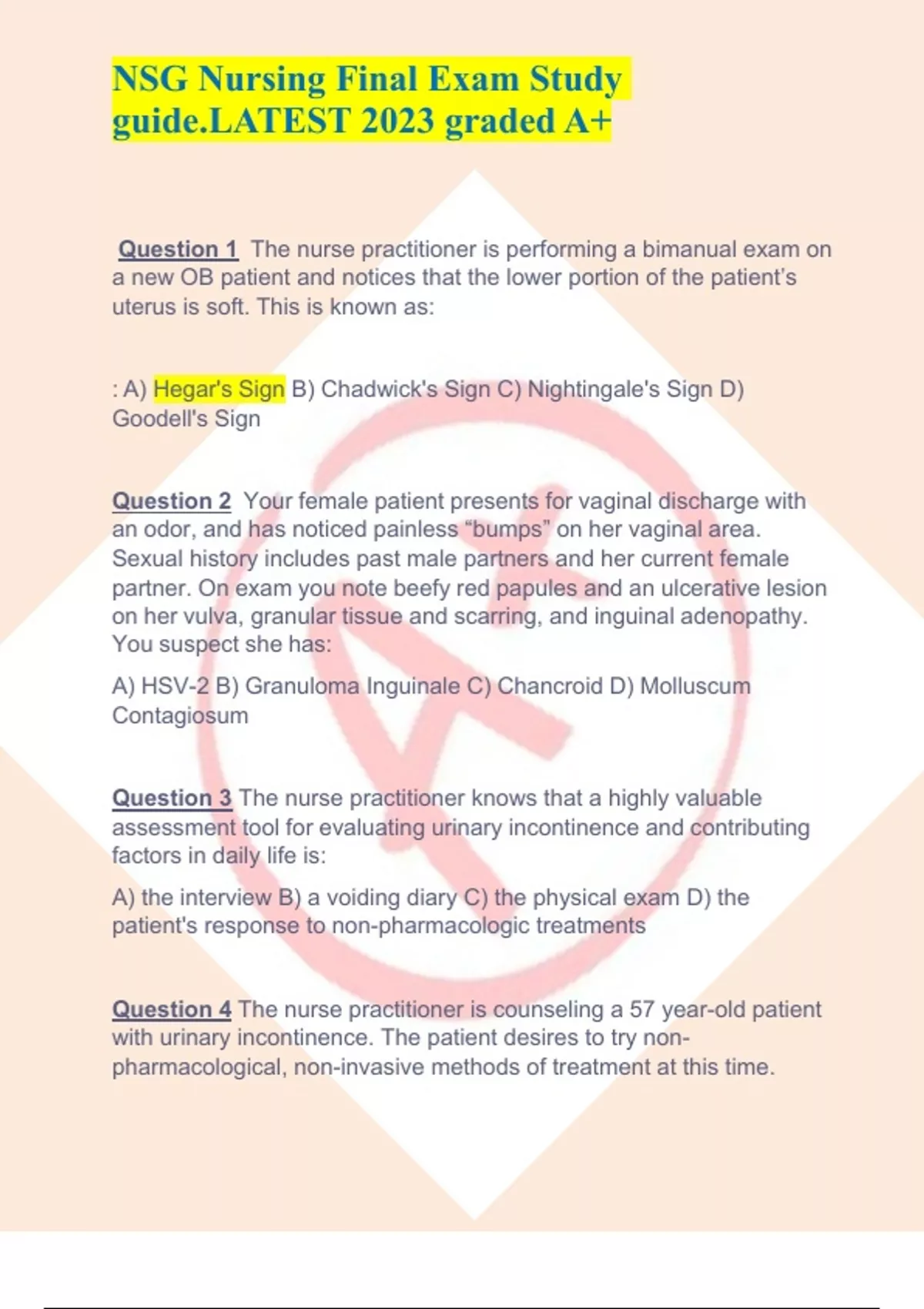 NGN NURSING FUNDAMENTA PN HESI Exit V2 Exam Questions and Answer Latest Update 2023/2024 Graded A 1)The LPN/LVN is preparing to ambulate a postoperative client after cardiac surgery. The nurse plans to do which to enable the client to best tolerate the ambulation? 1.Provide the client with a walker. 2.Remove the telemetry equipment. 3.Encourage
