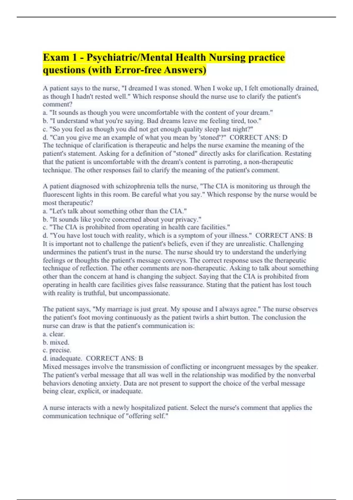 Exam 1 - Psychiatric/Mental Health Nursing practice questions (with Error-free Answers) THE PRACTICE OF MENTAL HEALTH/ PSYCHIATRIC NURSING (A+ GUARANTEED) OCC 1520 UNIT 1 OVERVIEW OF PSYCHIATRIC NURSING (100% Errorless Answers) Mental Health Nursing (With Complete Solutions) Psychiatric Nursing – PRELIMS (With Error-Free Solutions 100%) Psychiatric