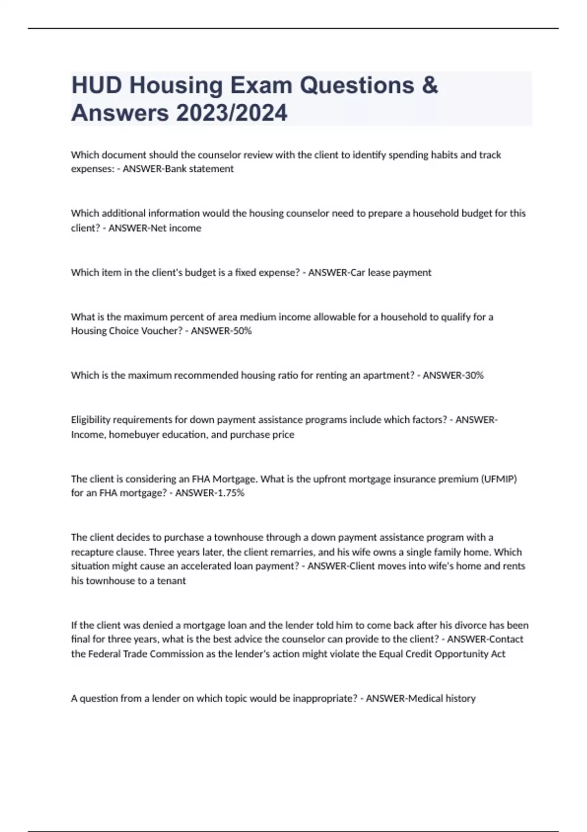 HUD Housing Counseling Exam Questions & Answers 2023/2024