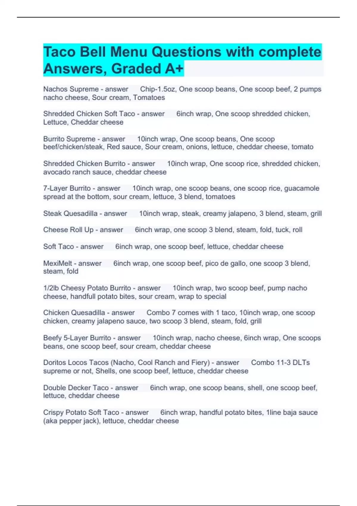 Exam (elaborations) Taco Bell Questions with complete Answers 2023 Exam (elaborations) **** taco bell Questions with complete solutions| Graded A+ Exam (elaborations) Taco Bell Manager Test Questions with complete Answers 2023 Exam (elaborations) Tacobell: Guide on how to make food Questions with complete Answers 2023 Exam (elaborations) T
