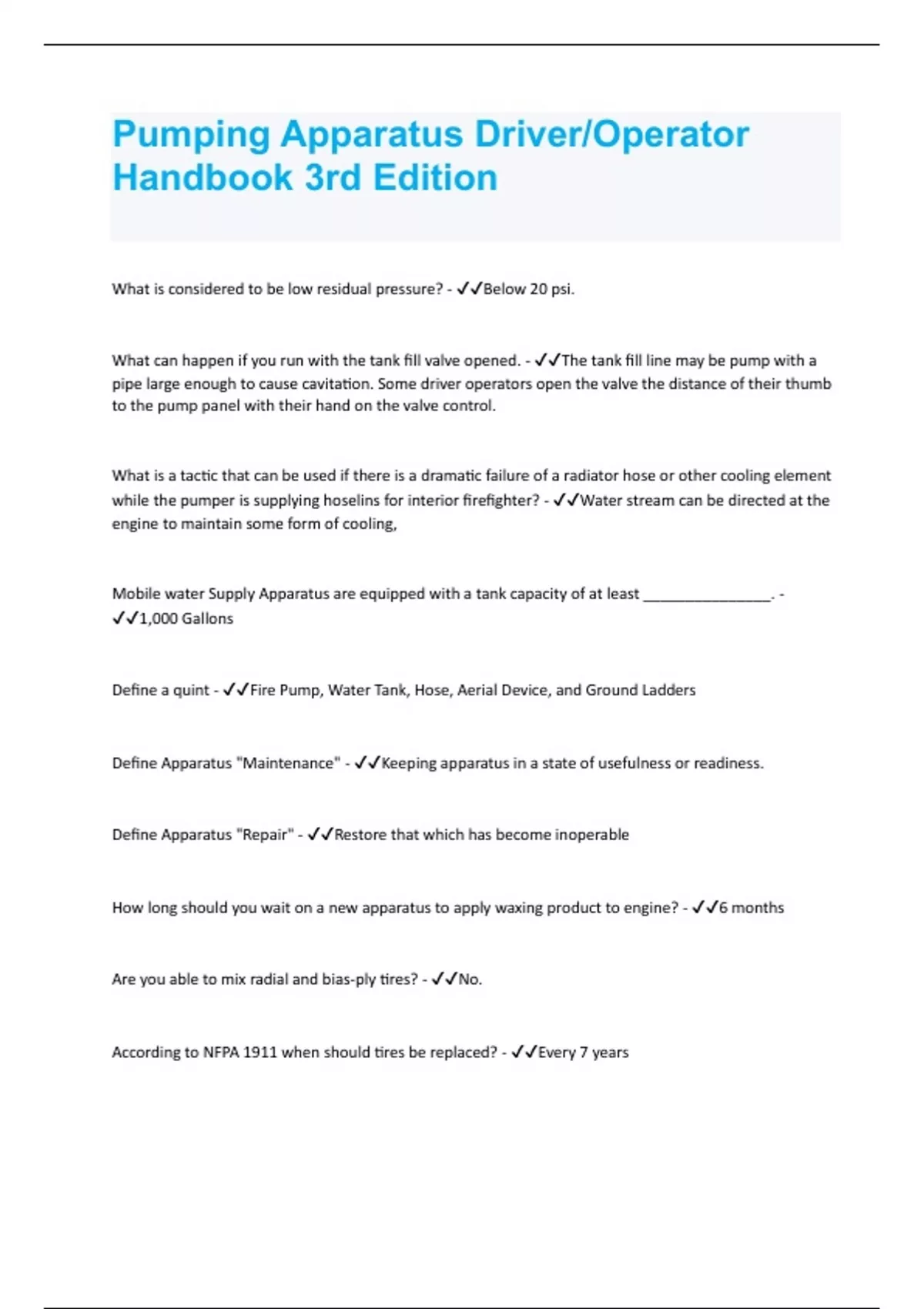 Pumping Apparatus Driver/Operator Handbook | Questions and Answers with complete solution