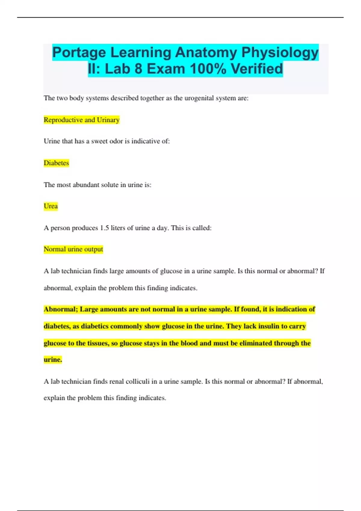 Portage Learning Anatomy Physiology II: Lab 1~ 8 Bundled Exams 100% Correct