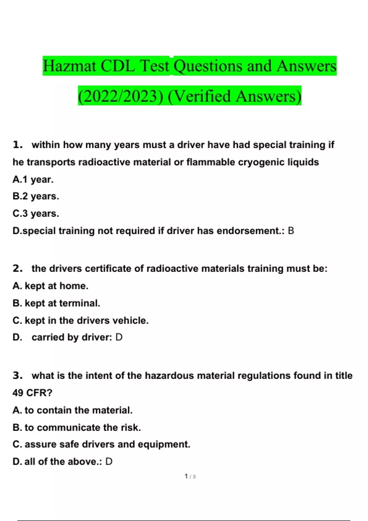 HazMat Training Test Questions and Answers 2022/2023 Verified Answers