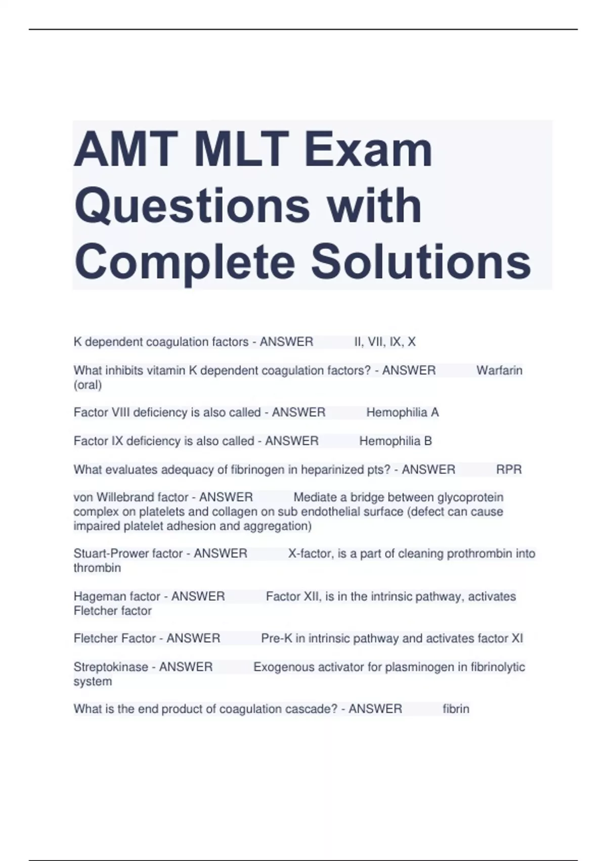 Blood Bank Review Questions and Answers For AMT MLT Exam 2 Exam (elaborations) Chemistry Review Questions and Answers for MLT AMT Exam 3 Exam (elaborations) Urinalysis Review Questions and Answers for AMT MLT Exam 4 Exam (elaborations) AMT MLT PRACTICE TEST QUESTIONS AND ANSWERS 5 Exam (elaborations) Hematology Review Questions and Answers For
