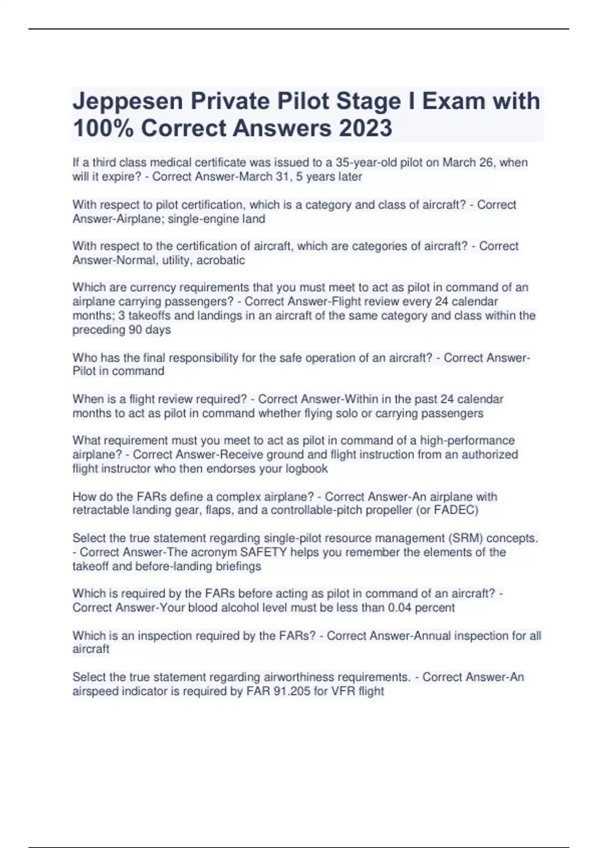 Jeppesen Private Pilot Stage I Exam with 100% Correct Answers 2023,Jeppesen Private Pilot Stage II Exam with 100% Correct Answers 2023,Jeppesen Private Pilot Stage III Exam with 100% Correct Answers