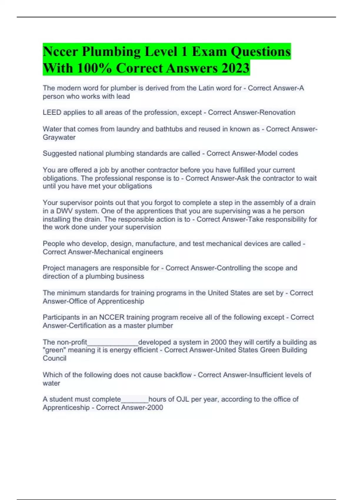 Nccer Plumbing Level 1 Exam Questions With 100% Correct Answers 2023 Module One Introduction To The Plumbing Profession Questions And Answers 2023 Plumbing Book Module 7 Exam With 100% Correct Answers 2023 Plumbing Exam With 100% Correct Answers 2023 Plumbing Level 1, Module 1 Exam With 100% Correct Answers 2023 Plumbing Book Module 9 Exam With