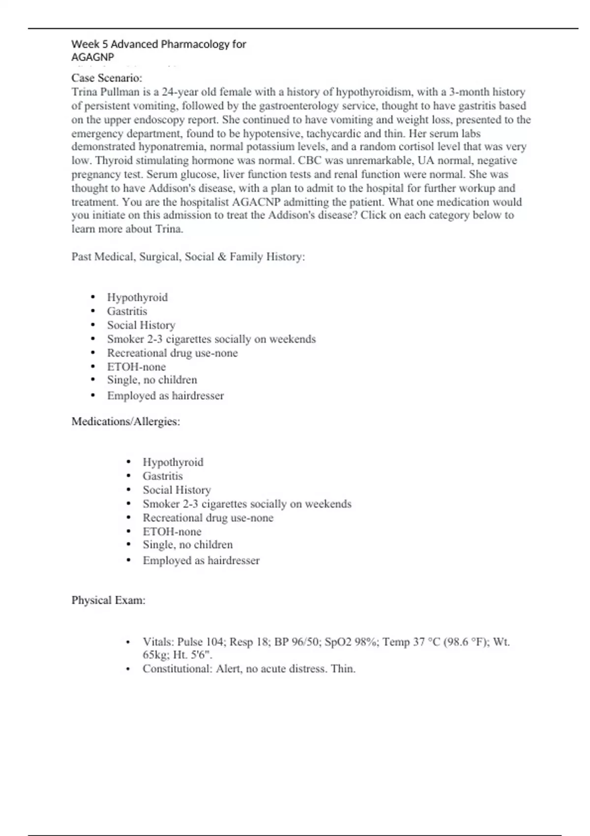 NR 567 Week 5 Discussion Addison s Disease Medication NR 567 Week 5 Discussion Case Scenario Discussion Addison's Disease Medication NR 567 Week 5 Study Worksheet Endocrine