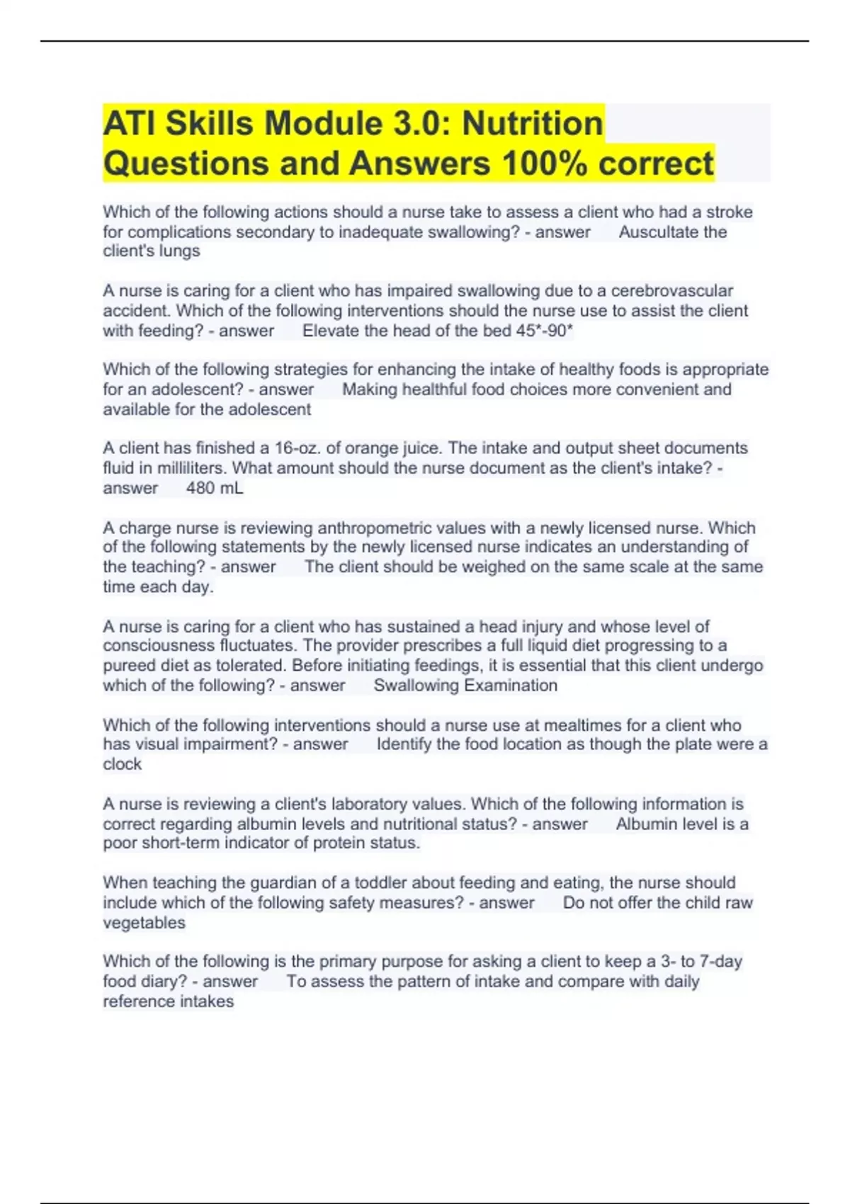 Exam (elaborations) ATI ADAPTIVE QUIZZING: NUTRITION QUESTIONS AND ANSWERS 2023 Exam (elaborations) ATI Nutrition Ch. 8-10 Questions and Answers 2023 Exam (elaborations) ATI RN Nutrition Practice B Questions and Answers 2023 Exam (elaborations) ATI Nutrition Chapter 3: Nutrition assessment Questions and Answers 2023 Exam (elaborations) ATI