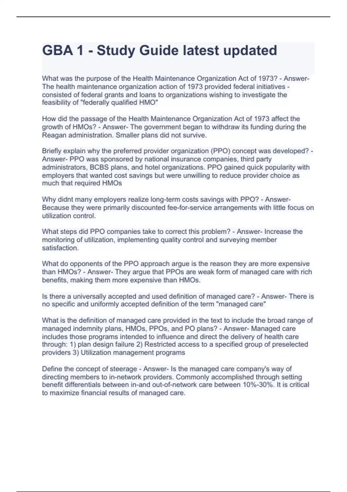GBA 1 - Study Guide latest updated CEBS - GBA 3 - Module 3 Questions with correct Answers GBA 1- DIRECTING BENEFITS PROGRAM PART 1 Exam 2023 CEBS GBA 2 - Module 2 Rating and Premium Setting Exam with complete solutions CEBS GBA Exam 1 with complete solutions CEBS GBA Exam 2 Questions and Answers CEBS GBA 1 Practice Exam Questions (2023) with correc
