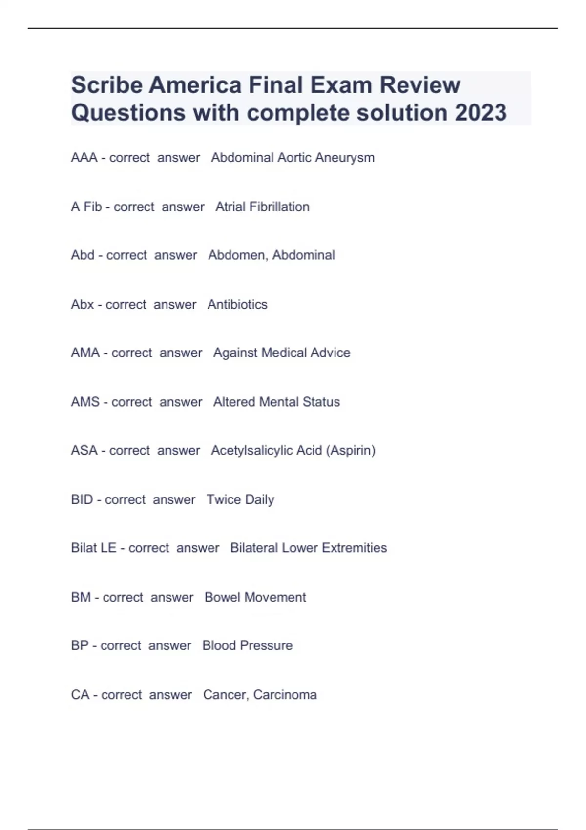 Scribe America Final Exam Question and answers 100% correct 2023 Exam (elaborations) Scribe America Physical Exam Question and answers rated A+ 2023 Exam (elaborations) Scribe America Final Exam Questions with complete solution 2023 Exam (elaborations) Scribe America Final Exam Review Questions (Courses 1-5) already sorted with answers 2023