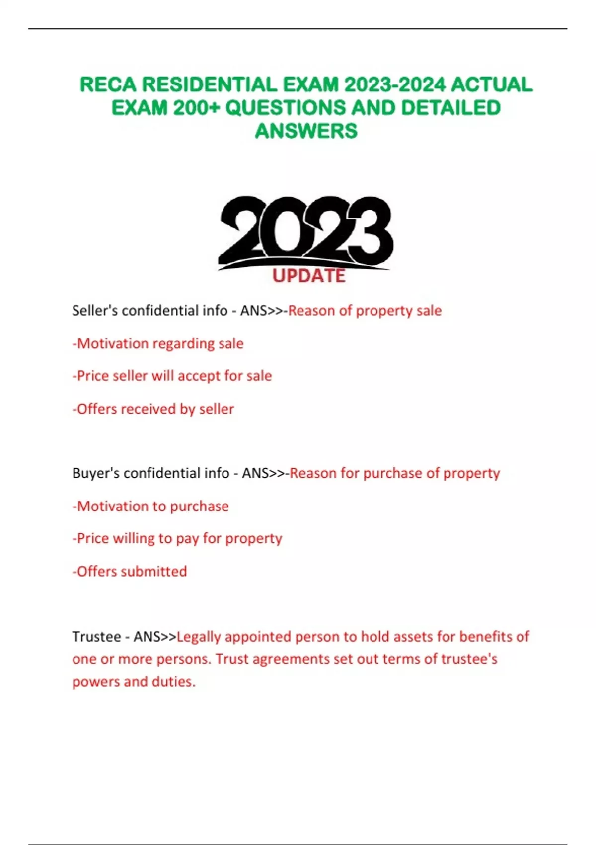 RECA RESIDENTIAL EXAM ACTUAL EXAM 200+ QUESTIONS AND DETAILED ANSWERS 2 Exam (elaborations) RECA Residential Exam Questions and Answers GRADED A
