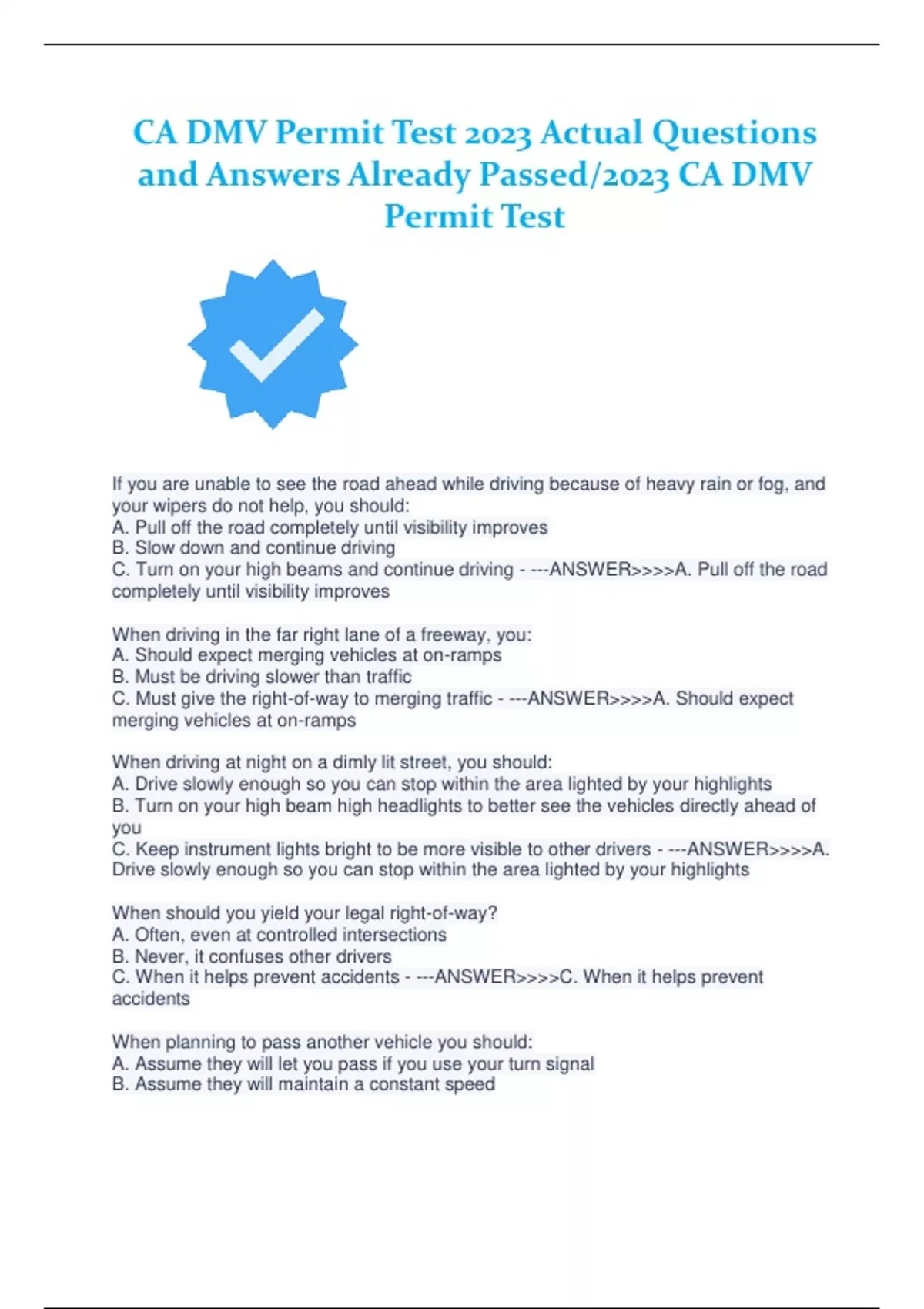 CA DMV Permit Test 2023 Actual Questions and Answers Already Passed/2023 CA DMV Permit Test