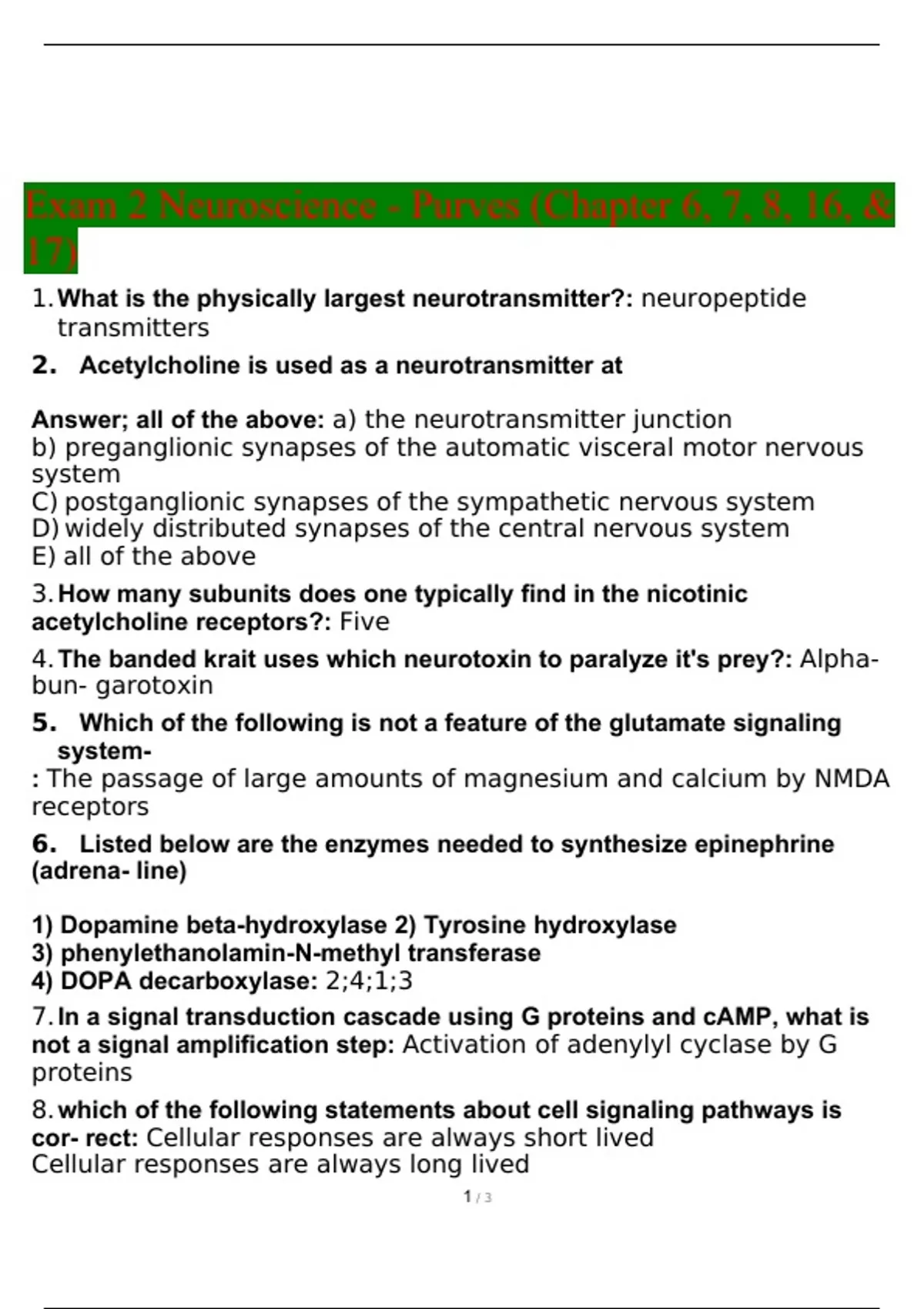 Neuroscience 6th Edition Test Bank by Purves | 100% Correct Answers | 34 Chapters