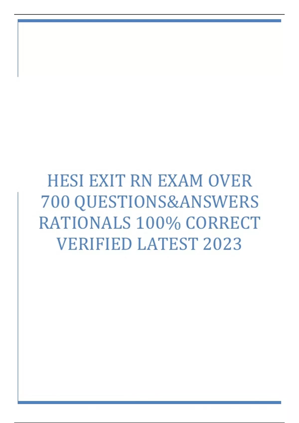 1 Exam (elaborations) Summary HESI Exit RN Exam Over 700 Questions, Answers Rationale New 2022/2023 latest 100%. 2 Exam (elaborations) HESI EXIT RN EXAM OVER 700 QUESTIONS&ANSWERS RATIONALS 100% CORRECT VERIFIED LATEST 2023