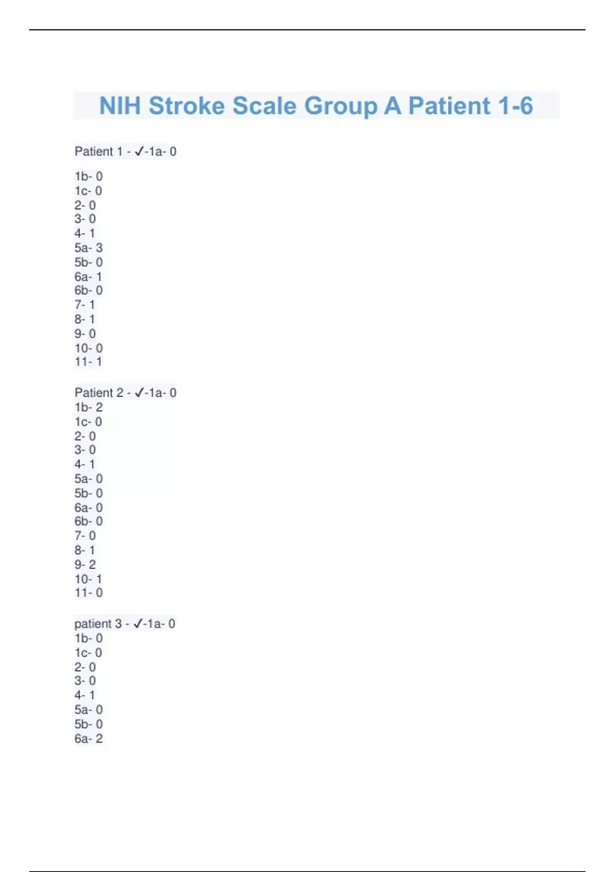 NIH Stroke Scale Group A Patient 1-6 (Latest 2023/2024) Verified Answers by Expert. 100% Correct