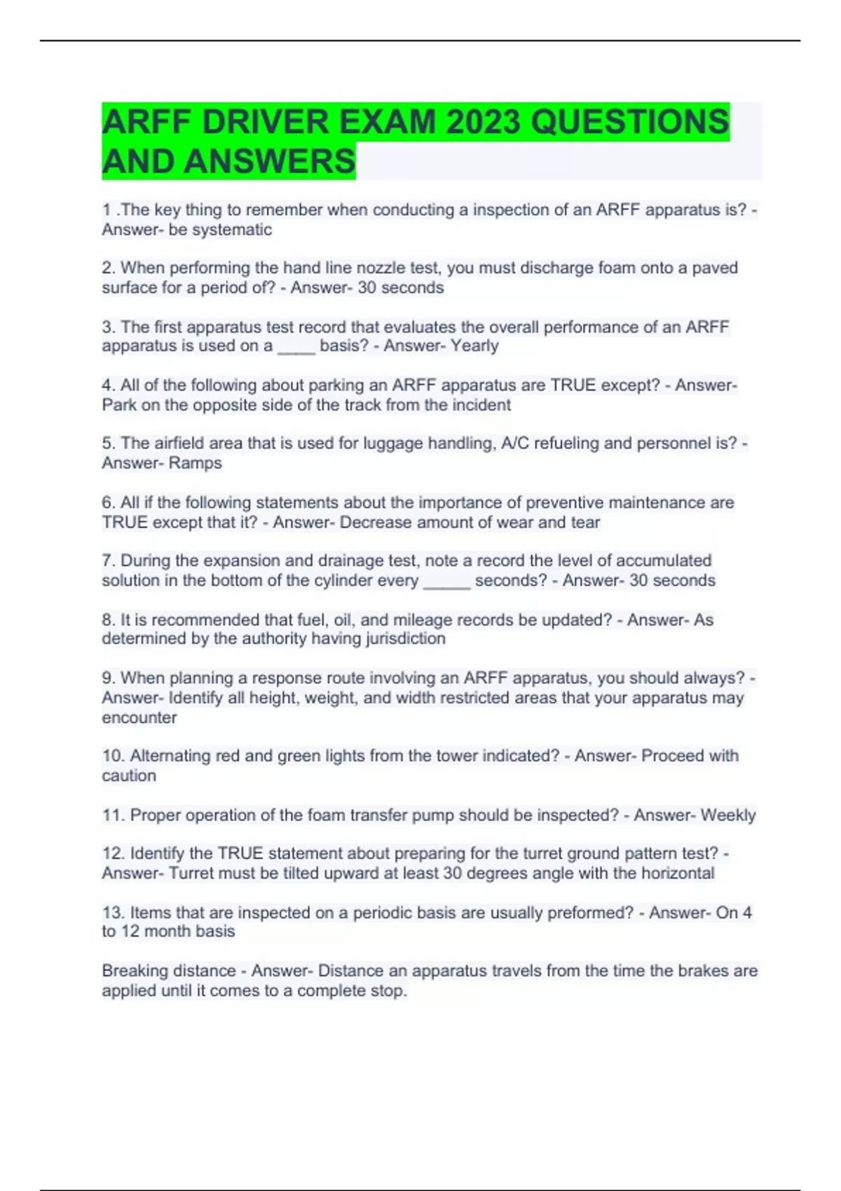 ARFF DRIVER EXAM 2023 QUESTIONS AND ANSWERS ARFF Operations Exam Questions with 100% correct Answers ARFF TEST QUESTIONS & ANSWERS 2023 ARFF - Driver Operator - Module 3 Questions and Answers Fire Apparatus Driver/Operator – ARFF Exam Questions with correct Answers Arff CCRE Exam Questions and Answers 2023 CDCs ARFF Exam Questions and Answers