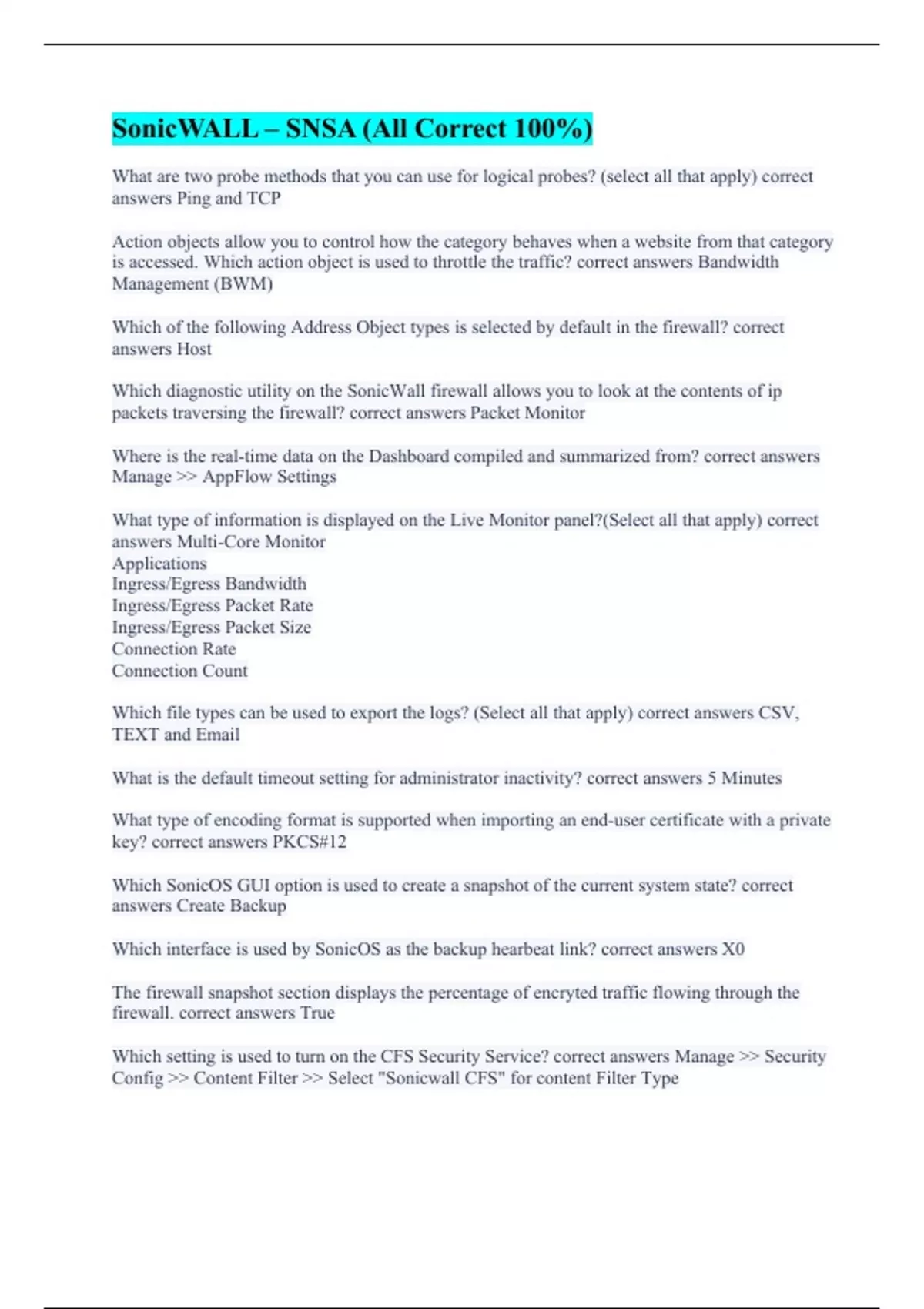 SonicWALL – SNSA (All Correct 100%) SonicWall Network Security Administrator (SNSA) A+ Graded Solutions. Online SNSA – Craig (A+ Graded Already) SNSA 2 (100% Correct) SonicWALL – SNSA (100% Accurate Answers) SONICWALL SNSA – 2023 (Possible Questions Accurately Answered) SNSA Study (Graded A+) SonicWALL Basic Administration Questions (100% Verified)