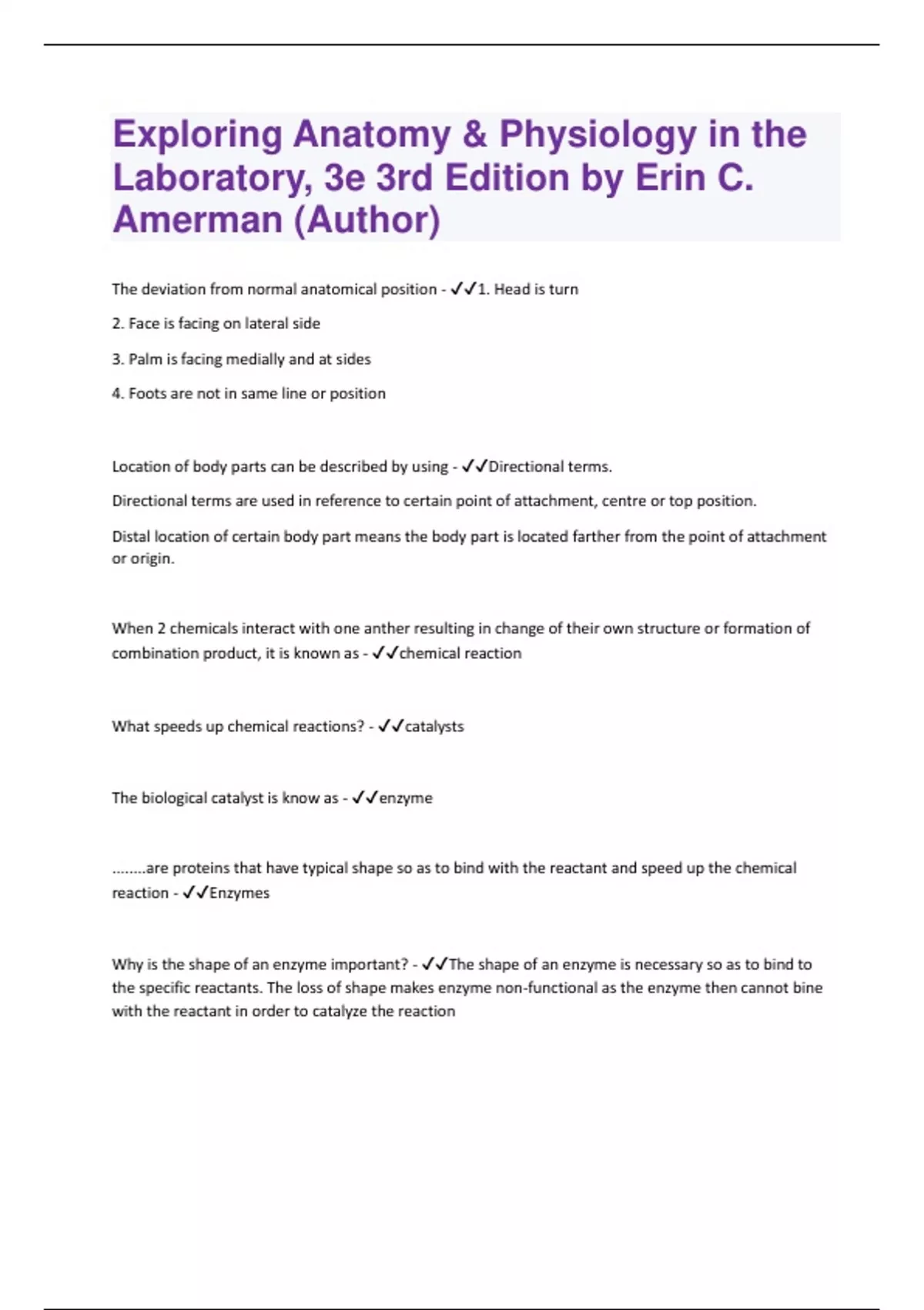 Exploring Anatomy & Physiology in the Laboratory, 3e 3rd Edition by Erin C. Amerman (Author) | Questions with 100 % correct Answers | Verified