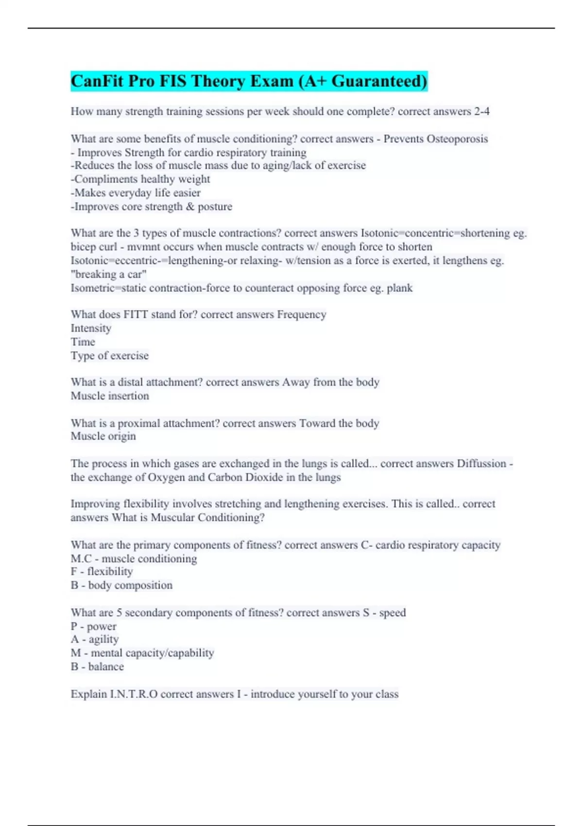 CanFit Pro FIS Theory Exam (A+ Guaranteed) CanFitPro (With Accurate Answers) CANFITPRO Theory Exam (with Complete Solutions) Canfitpro Theory Exam (100% Errorless Answers) CanfitPro terms (All Correct) CanFitPro PTS Certification (With 100% Error-free Answers) CanFitPro Personal Training Specialist Theory Exam (Already Graded A+) Canfitpro Exam Pre